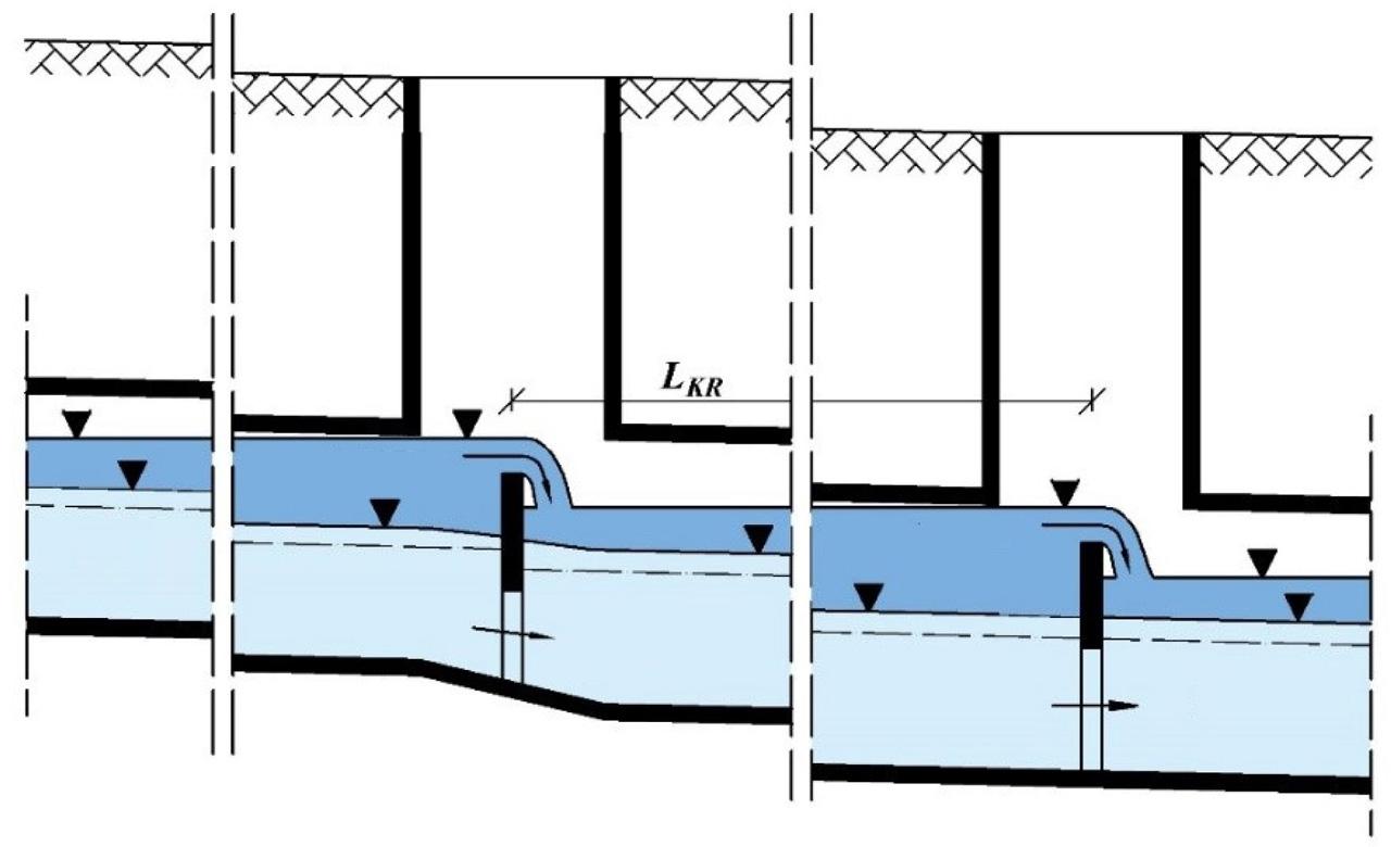 Scheme of the retention sewage canal with damming partitions that create stormwater canal retention spaces (the light blue - average distribution of the liquid stream mirror in the conduits of a traditional rainwater systems; the blue - liquid stream distribution and retention capacity of the rainwater sewage system after equipping it with damming partition), LKR—distance between adjacent damming partitions [7].