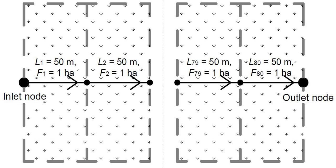 The scheme of the model catchment, total drainage area F = 80 ha (developed based on [1]).