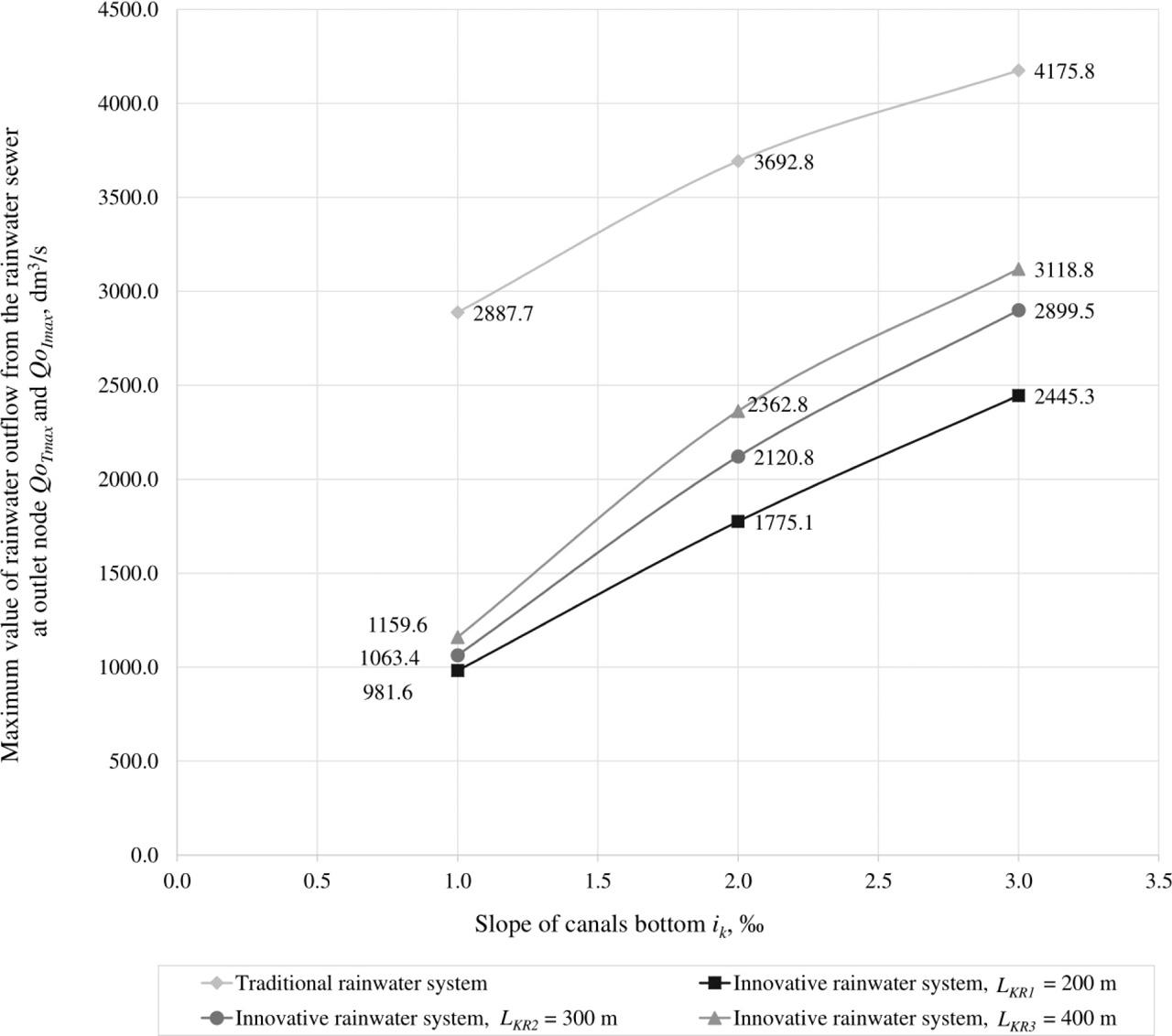 In the case of traditional sewerage system for slope of canals ik = 1‰, the maximum rainwater outflow from the sewage is QoTmax = 2887.7 dm3/s. However, for slope ik = 2‰ the outflow is QoTmax = 3692.8 dm3/s, for slope ik = 3‰ outflow intensity increases almost 1.5 times to the value QoTmax = 4175.9 dm3/s.