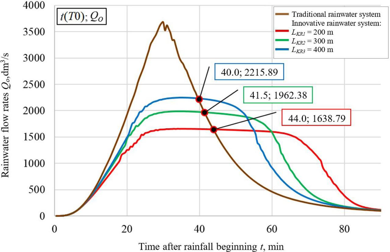 For example, considering an innovative system for the slope of bottom ik = 1 ‰ and damming barriers spacing LKR1 = 200 m, it is possible to obtain an almost threefold reduction of flow from the value QoTmax = 2887.7 dm3/s to QoImax = 981.6 dm3/s. For LKR2 = 300 m, the flow is reduced by 2.7 times (the outflow rate is 1063.4 dm3/s). For LKR3 = 400 m, the outflow is almost reduced by 2.5 times (QoImax = 1159.6 dm3/s) compared to the traditional storm sewer.