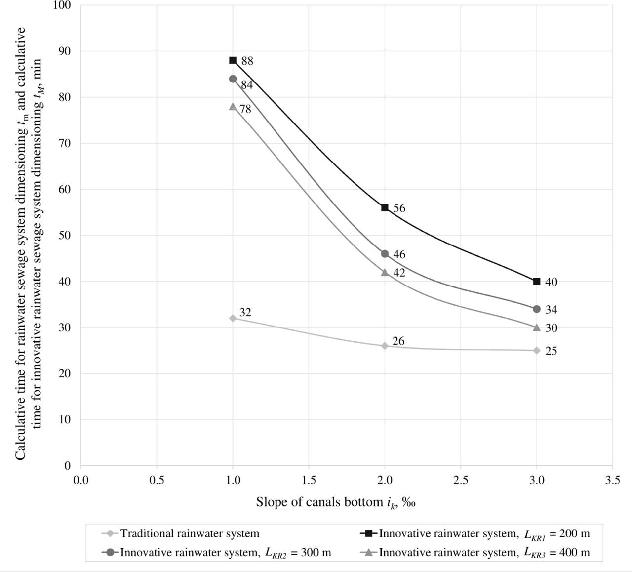 As shown by the curves in Figure 9, the change of canals slope ik directly affects the determined value of critical time for dimensioning both the traditional and the innovative system. In both systems, an increase of canal slope ik results in a decrease of critical time for dimensioning sewage systems. As the spacing of the damming baffles LKR shortens, the value of the critical time tM increases. Many factors, especially parameters characterizing the drainage catchment impact on the value of critical ran duration. The biggest differences between the critical time for rainwater sewage system dimensioning tm and the critical time for innovative rainwater sewage system dimensioning tM occur at slopes ik = 1‰.
