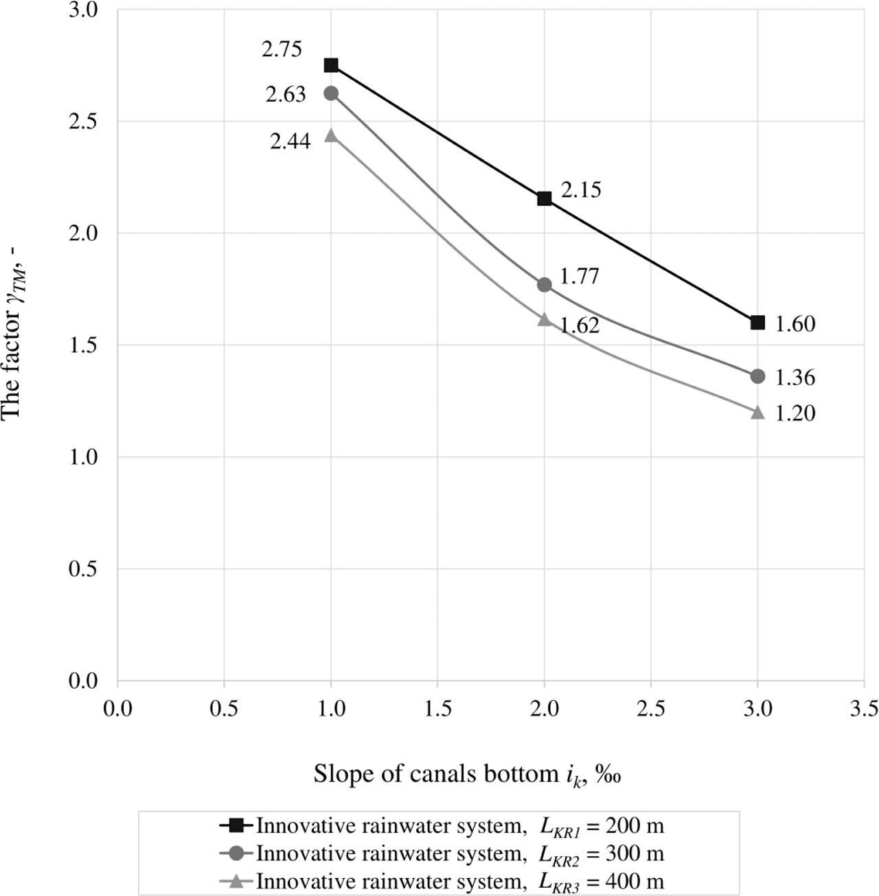 The dependence between the values of the determinate time for the dimensioning of the traditional rainwater system tM and the determinate time for the dimensioning of the retention canals system tM is described by the coefficient of the determinate times γTM [1] by the following formula (2):