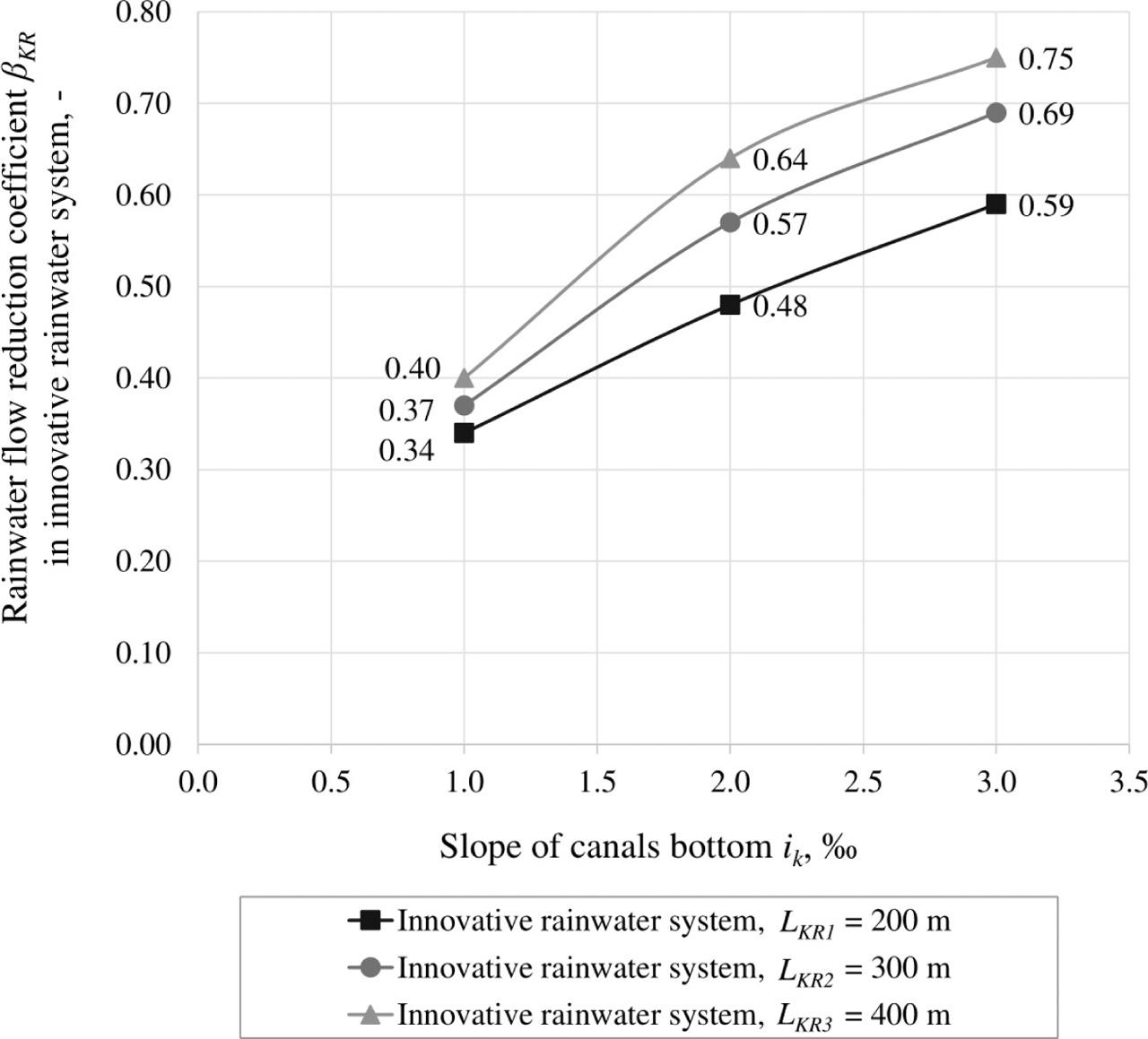 Rainwater flow reduction coefficient βKR in innovative rainwater system for different slopes of canals ik and damming baffle spacing LKR (based on [1]).