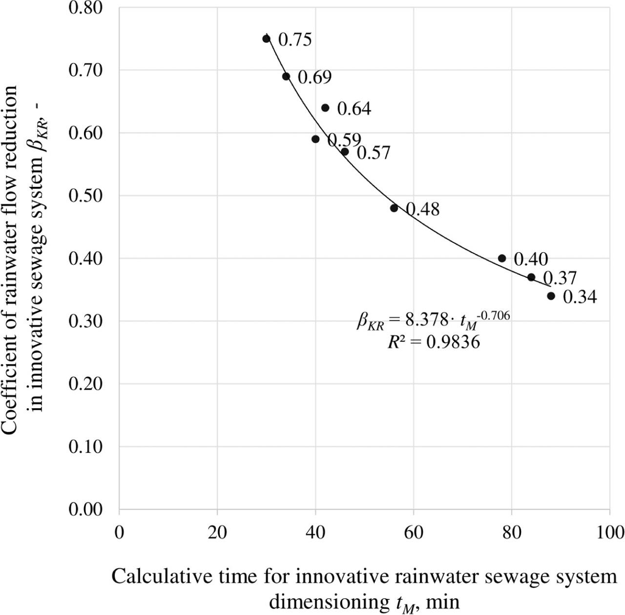This relationship was formulated based on the pairs of results for all variants presented earlier in Table 2, including the calculative time for the innovative rainwater sewage system dimensioning tM and the corresponding rainfall flow reduction coefficient βKR. Based on this, trend lines were created and the equation describing this relationship was determined. To conclude one can say that there is a close relationship between the time tM and the reduction coefficient βKR. The results are well fitted to the curve as evidenced by the high value of the coefficient of determination R2 = 0.9836. The studies [1] have shown that for specific design conditions, it is possible to establish an unambiguous curve of the relationship between the critical time tM and the reduction factor βKR.