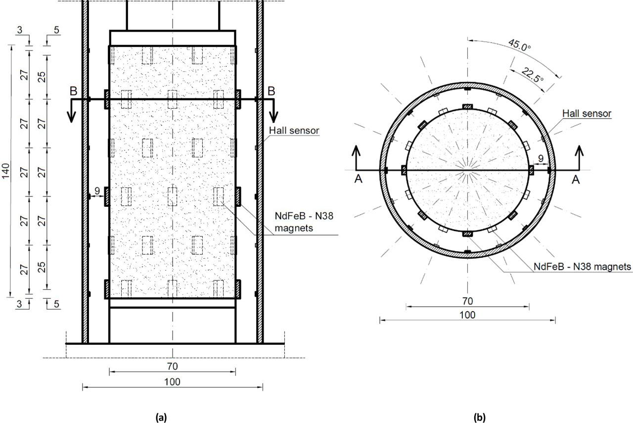 ![The arrangement of magnets on the specimen's surface and Hall sensors on the internal cylinder (a) vertical (A-A) section; the middle dimension line refers to the placement of the Hall sensors and the right dimension line refers to the magnets, (b) horizontal (B-B) section [mm].](https://sciendo-parsed.s3.eu-central-1.amazonaws.com/64737a3e4e662f30ba53f8da/j_sgem-2023-0018_fig_002.jpg?X-Amz-Algorithm=AWS4-HMAC-SHA256&X-Amz-Content-Sha256=UNSIGNED-PAYLOAD&X-Amz-Credential=ASIA6AP2G7AKMOBUT7WC%2F20260221%2Feu-central-1%2Fs3%2Faws4_request&X-Amz-Date=20260221T221426Z&X-Amz-Expires=3600&X-Amz-Security-Token=IQoJb3JpZ2luX2VjEOn%2F%2F%2F%2F%2F%2F%2F%2F%2F%2FwEaDGV1LWNlbnRyYWwtMSJIMEYCIQDReu5H%2F9R5IRgDvC00%2BN5Z2fj9q38RVfw9d07466IRfAIhAPrJJqrlrDHaVuPvSIzW7j4qSoua77lSNBEBptfJbM6VKsUFCLL%2F%2F%2F%2F%2F%2F%2F%2F%2F%2FwEQAhoMOTYzMTM0Mjg5OTQwIgzaGxxzJiNlEvUVx%2B4qmQXcm7QX3EMJRqUA8xxMxzVDEFelKYAcZ4s2SZZ35JY7XovlW2z7%2F1g91L2Y2LDIayDkSP9P3hHivHPYgYrg%2BXyHV6UwRCB1RDlrht2x1EKhHCZVu9V8Qo9oUPeIdwpMKFOd6BqSDJYigK1ClohBM4rXo%2FeRO4EZ1RmE1zJR45U0pi2wAMTnVNx3%2Fpj2HYcuugdRa4FJ2O59ybvba5h29NLzclgBDD0u68jlV%2BBRw4apWgjDqvpVRdIjViJ4RXfWMitRtTCMxk2VV1GM4BosFYJshFqbNCZZQASjTvaRNqj5SHEz7DL2ueJo6aZNRo75jd37omy5bH3arTMmrgL5%2BBlhggEN2zeG%2BuQP5LR9wJglKw8BPMbZlUH2n3mwPbNN58PncG5bSGpMMMLnb03YFaM%2BH%2FgQFIIt1hhIfslkcr8%2BTJ12HfQPJA%2F6WVqv1oYqvdFbjmGOK7qYsydZYFOOLxY3Fzn%2BXGUc8WS7kMCgZK%2BHF%2FFIDOvgMyV2TA9A8979KPhjVJz6uQHUVrLpQo7aPPF9Vqr2AyMmo6miQdXw8Ej0sx9cRoB%2F0nkBMTnr3Q3kZ1EWOI2JZTlLjE8F1N%2B%2BWvU1U9aI5K7YVs00BH4g6RvYAve0ycWhqBn5oMIXeppmiTHmpnxvRZW8CaTjcVuqb%2BI%2F2rZ%2BHOtP8cpSn6hJt6e5FydpZqj0SdqYKZ6BUW7TmFYCJnCWOv3JlguIy44feTqpt3f1XWDljyvn%2F2HpgsiBUO9RH5scUSYpGitO0%2BGc90jWnrOokrgWNjW%2FPdZ0cKiyNmAH3KoKWahJ853e5QMJPcPlc93PGGNwSrm%2FAmlQVqpLZiDPnwMulwR1m2P%2FVpfIfx8VlCXE%2B0Apu0Wa7cX2RiNTq15dlT8ofDDFw%2BfMBjqwAXGiVGHY0J5aSjMnmArZ8rbEgR04kZytM5ZhyhILYMqkL8qTQCWj5QlD7ApIw7txUcJ5dV1txvenkPZixRgkB5Gh0Zjs4gqCiwG3XFCvdLngrDtxG%2BvpcM1bumq1%2BjBacBCnPZp5gxDM2zkKlYTeXtMYKJQCVe2KhqJY4cBcnLPgVjKl%2F%2FjaJQGJKO6lcGyrrMzeGBOSMIflEHmUZd3kBELnd4RumrUOt7qvwNEwSlrQ&X-Amz-Signature=1b471a1ea3b0563d8a612989b2502bd4cb22db7a2595e8d7caa420df57f5e2fe&X-Amz-SignedHeaders=host&x-amz-checksum-mode=ENABLED&x-id=GetObject)