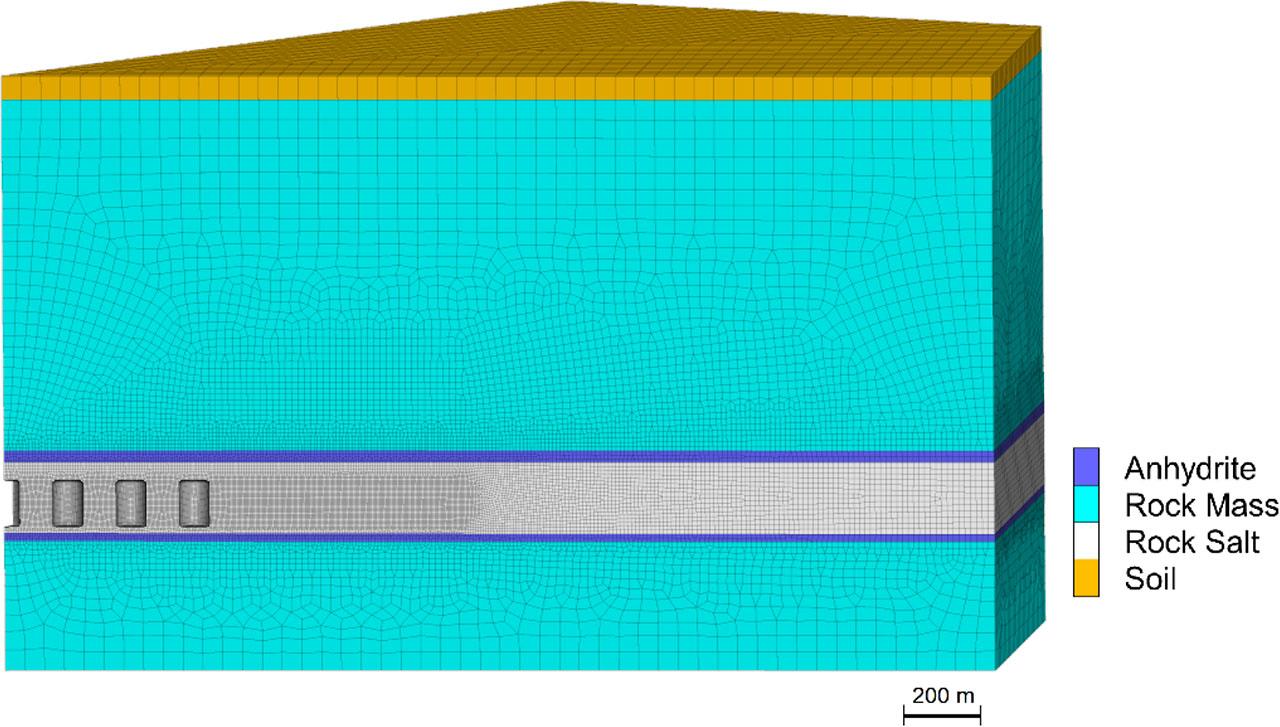 The rock mass mechanical behaviour was simulated with the use of the mechanical parameters and the constitutive models of the rock salt and the nonsalt rocks. Two different constitutive models were chosen to accurately project the viscoelastic plastic behaviour of rock salt and the elastic–plastic response of nonsalt rocks. The two-component Norton Power Law with a Mohr–Coulomb plasticity criterion was applied to describe the plastic yielding and creep of rock salt. However, the Mohr–Coulomb elastic–plastic model was used to simulate the mechanical behaviour of the surrounding rocks and the anhydrite.