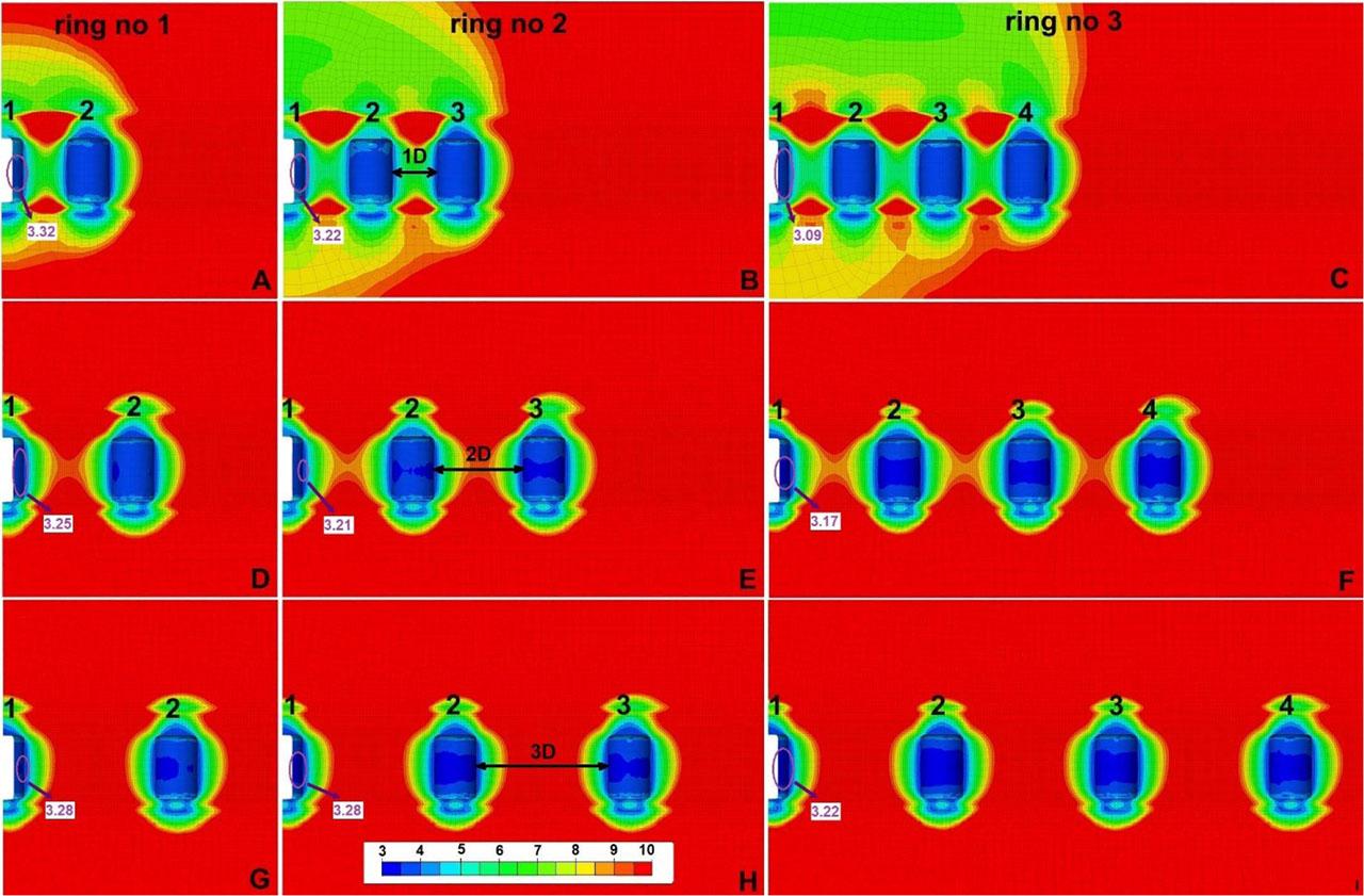 The maximum displacements, indicated in red, are predominantly located in the contour zone surrounding the caverns. These values gradually increase as the width of the pillar between two adjacent caverns decreases and the number of caverns in the ring increases (Fig. 4 A–I).
