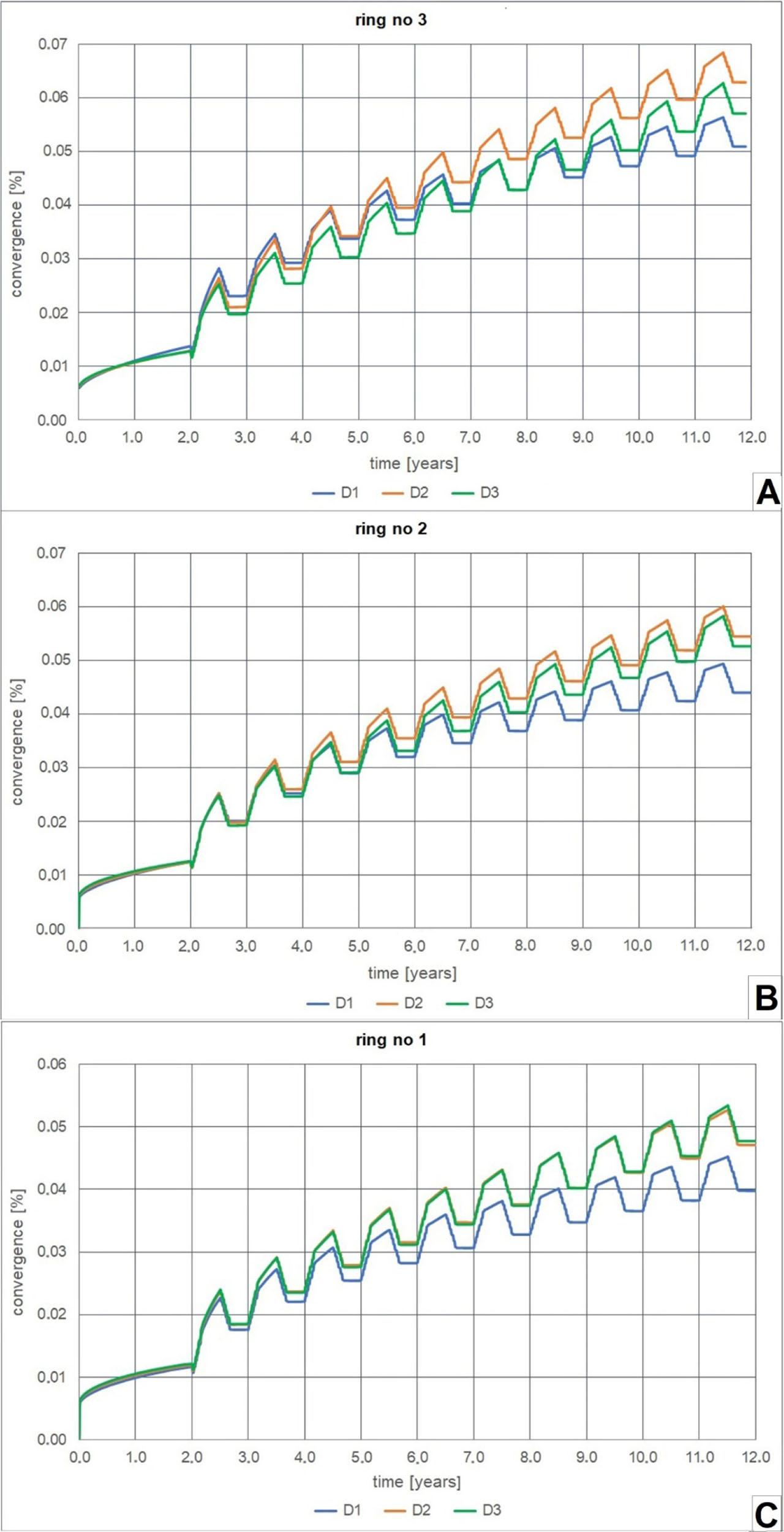 In addition, the changes in the pillar volume reflected by the cavern volume shrinkage (convergence) were evaluated. The cavern volume shrinkage was calculated as the ratio of the volume loss to the initial cavern volume.