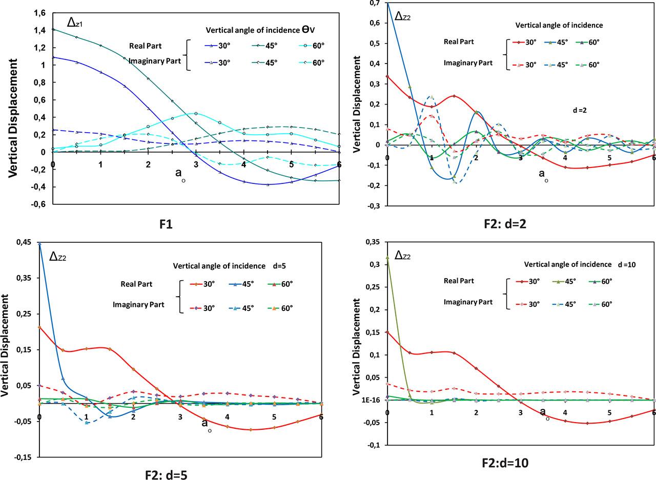 The variation in the movement of foundation 2 with respect to the angle of incidence is quite significant. Specifically, at an angle of incidence equal to 60°, the displacement Δx2 reaches its maximum value. However, for the other values of the vertical angle of incidence, such as 30° and 45°, the real part of the displacement tends toward zero. This indicates that the amplitudes of the free field motion for the SV waves are nearly zero for these angles, implying that the movement of foundation 2 closely follows the movement of the free field. Consequently, the displacement amplitude of the second foundation differs significantly from that of the first foundation under these conditions.