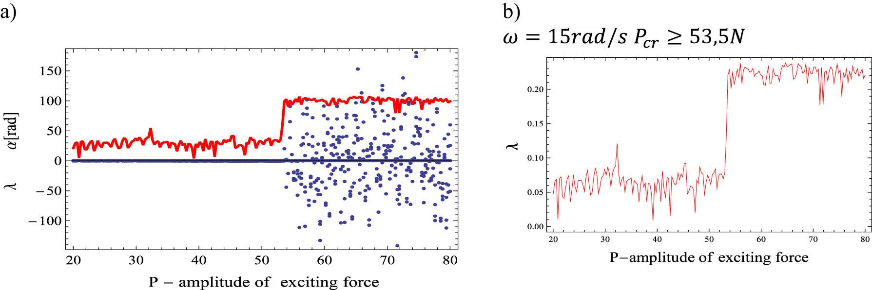 The range of variation of excitation amplitude F, in which chaotic vibrations are generated, is corroborated by the bifurcation diagram, constructed on the basis of the numerical integration of equation (17), together with the graph of the variation of the highest Lyapunov exponent as a function of excitation amplitude F (Figure 4). The variation of the highest Lyapunov exponent versus excitation amplitude F was determined by comparing the system response whose initial conditions differ by 10−4. When integrating equation (17), zero initial conditions