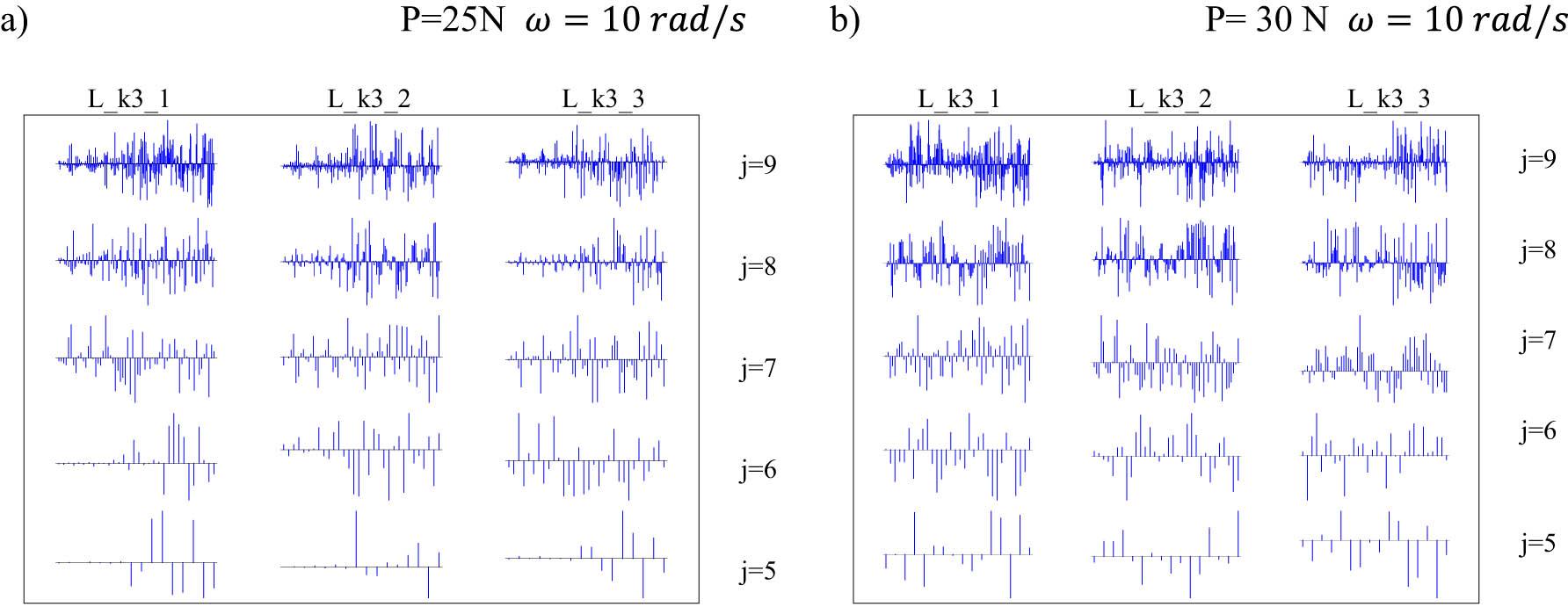 Selected resolution levels j of multiwavelet signal analysis coefficients in pre-critical state P = 25 N (a) and in post-critical state P = 30 N (b) for the system described by equation (18)