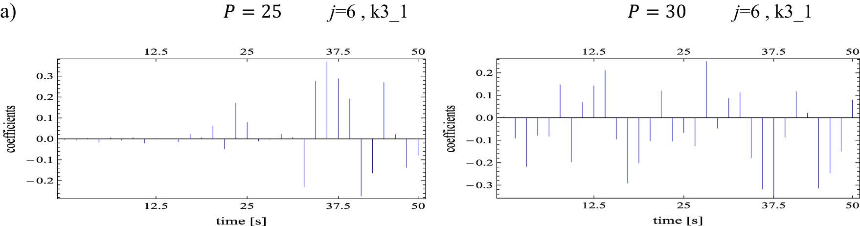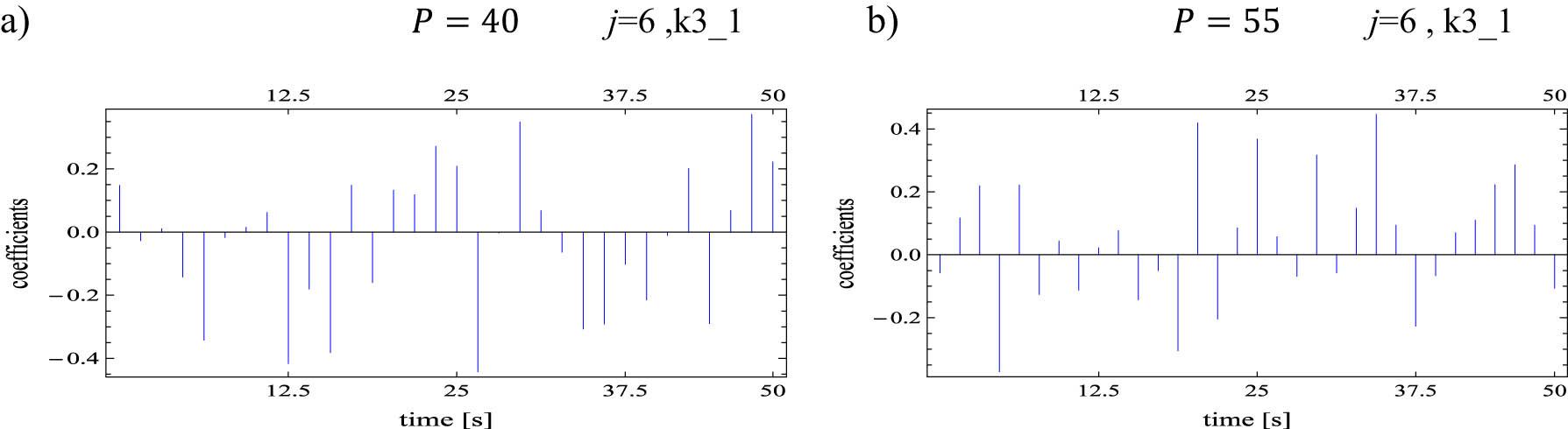 Multiwavelet expansion coefficients obtained at resolution level j = 6 in pre-critical state P = 25 N (a) and in post-critical state P = 30 N (b) for the system described by equation (18)