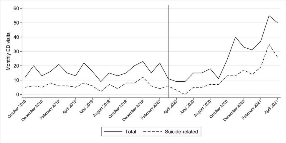In conclusion, shortly after the onset of the COVID-19 pandemic, there was an increase in pediatric psychiatric ED visits, especially due to suicide-related reasons. These data reinforce the crucial role of the ED in the management of acute mental health problems among youth and highlight the need for renovated efforts to enhance access to care outside of and during acute crises during the pandemic and its aftermath.