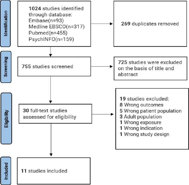Our search yielded 1,024 results (Cochrane number= 0; Embase (Ovid) number= 93; Medline EBCSO number= 317; PubMed number= 455; PsychINFO number= 159). 755 potential articles were identified after excluding duplicate publications.