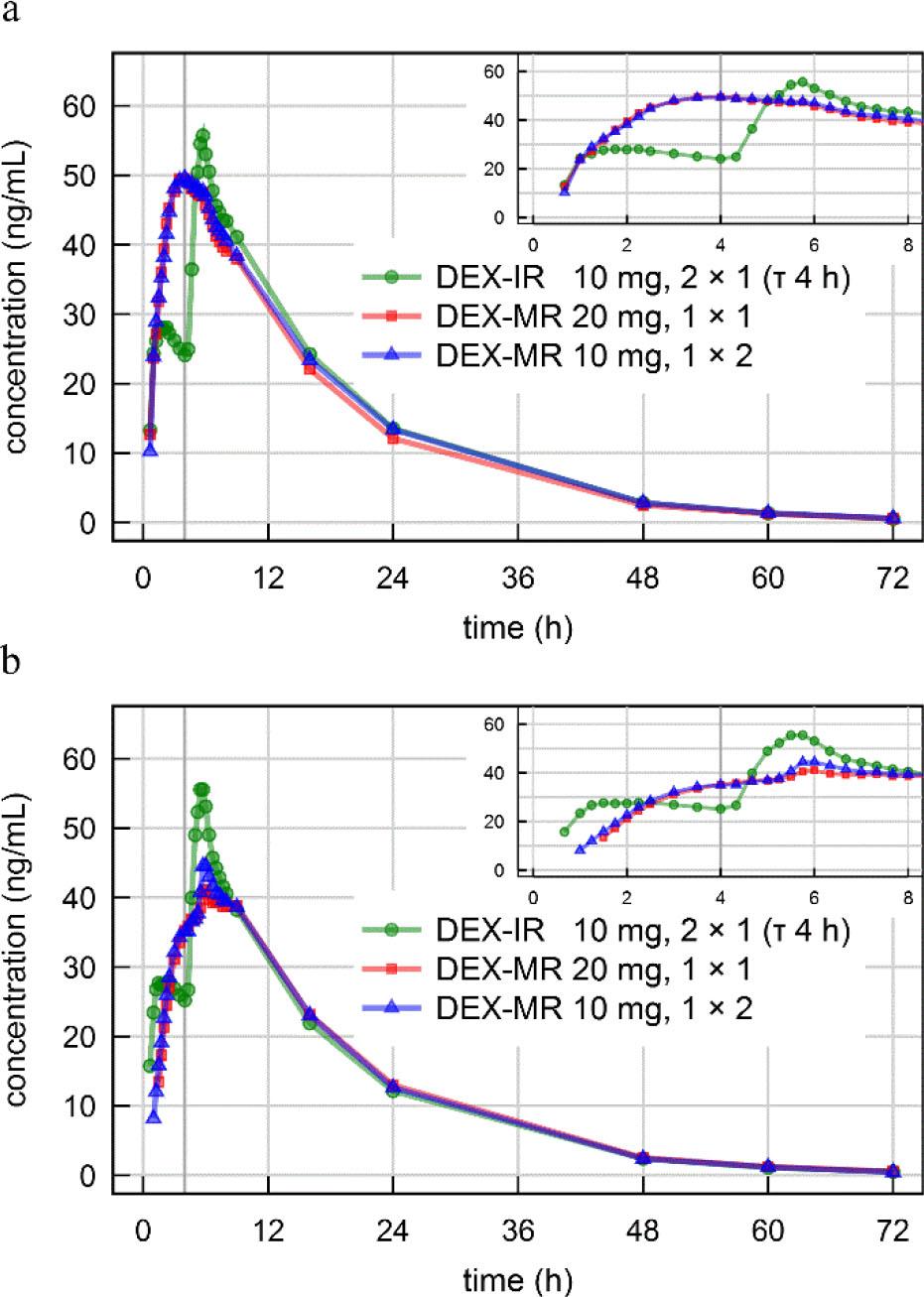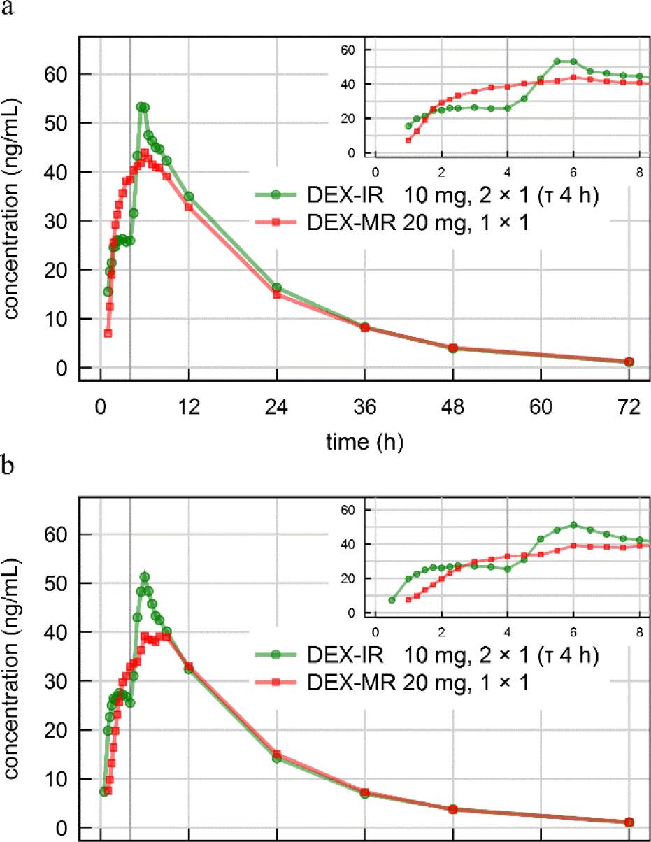 Under fasted conditions, a single 20 mg dose of DEX-MR 20 mg or DEX-MR 10 mg was bioequivalent to DEX-IR 10 mg given twice daily (τ 4 hours) with respect to rate (Cmax) and extent (AUC0–t and AUC0–∞) of bioavailability, since the 90% CIs of these PK metrics lied well within the pre-defined acceptance range of 80.00% to 125.00%. Median tmax of DEX-MR was shorter compared to DEX-IR for both the 20 mg (3.50 h vs. 5.75 h) and 10 mg (4.00 h vs. 5.75 h) strengths.