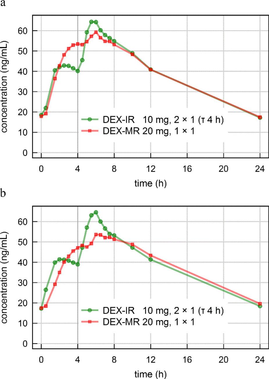 Under fed conditions, DEX-MR 10 mg (20 mg dose) was bioequivalent to DEX-IR 10 mg given twice daily (τ 4 hours), both for rate and extent of bioavailability. DEX-MR 20 mg met the bioequivalence criteria for AUC0–t and AUC0–∞. However, for Cmax, with 79.06% the lower confidence limit was slightly below the lower boundary of the acceptance range. Median tmax of DEX-MR was similar to the one of DEX-IR for both the 20 mg (6.00 h vs. 5.63 h) and 10 mg (6.00 h vs. 5.63 h) strengths.