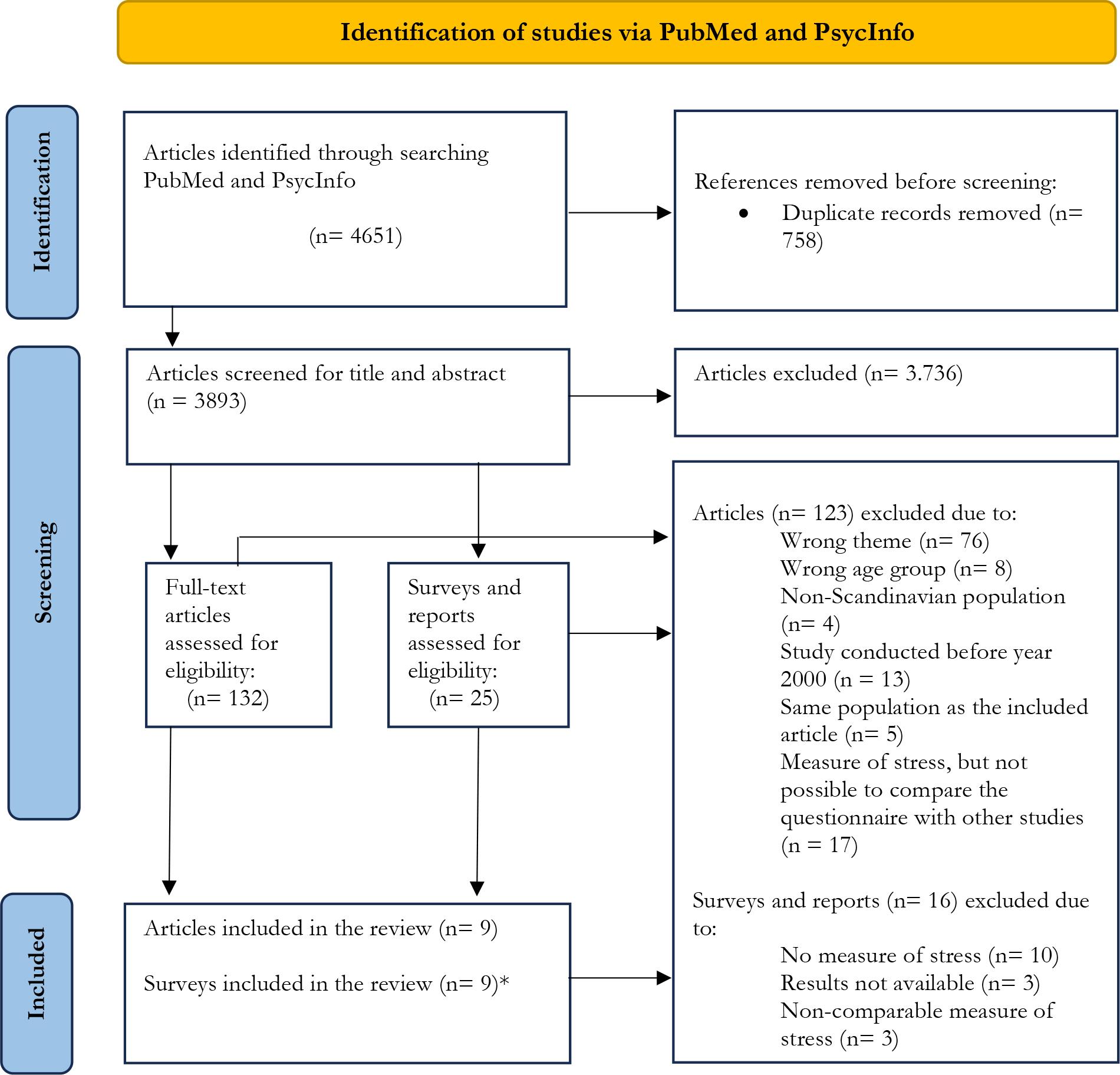 Description of the population and study design of the included papers, surveys, and reports, N=18_ The sample size and gender distribution reflect the number of participants between 13-18 years of age, who answered the stress questions_ “Year” is the year the population was assessed_ Surveys with Scandinavian titles, have been translated to English titles, when appropriate_