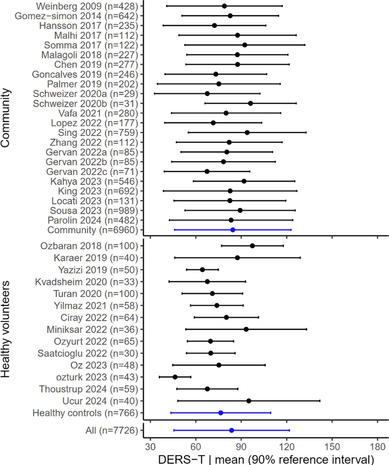 The range for the DERS-T is 36 to 180. The reference interval for Community stems from studies using background population data including youths experiencing heightened levels of psychopathology. The reference interval for healthy volunteers stem from studies including youths as symptom-free and psychiatrically healthy. The black reference intervals represent the dispersion of DERS-T from individual studies. The blue reference intervals represent the combined dispersion from three groups respectively: Community-based population (46.0–122.9), healthy volunteers (43.6–109.4), and all (45.5–121.8).