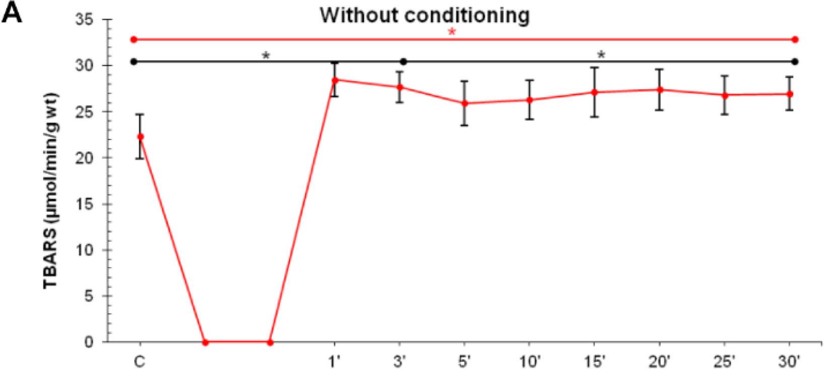 In the CG, values of TBARS were significantly higher in the third and last minute of reperfusion in comparison to the control values. In the PreC group, the application of MK-801 induced significant decrease of TBARS and that decreasing trend continued to the end of the experiment. On the other hand, in the PostC group there were no statistically significant changes in TBARS values (Figure 1A, 1B, 1C).