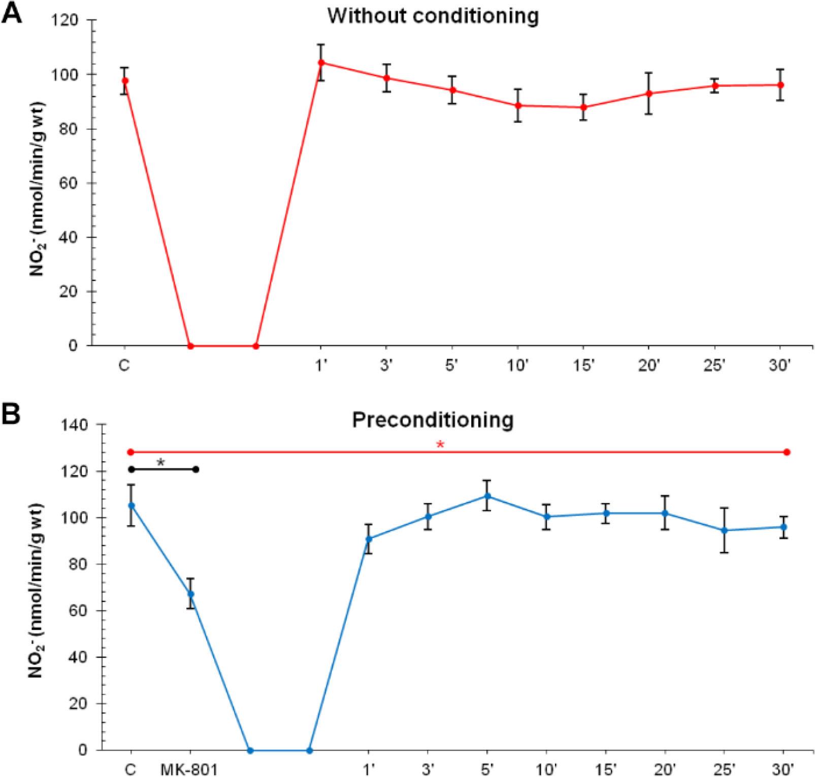Nitrite (NO2−) levels did not change significantly in all points of interest in the CG and in the PostC group, while in the PreC group NO2− values were significantly lower after the administration of MK-801 in comparison to the control values, as well as in the last minute of stabilization (Figure 2A, 2B, 2C).
