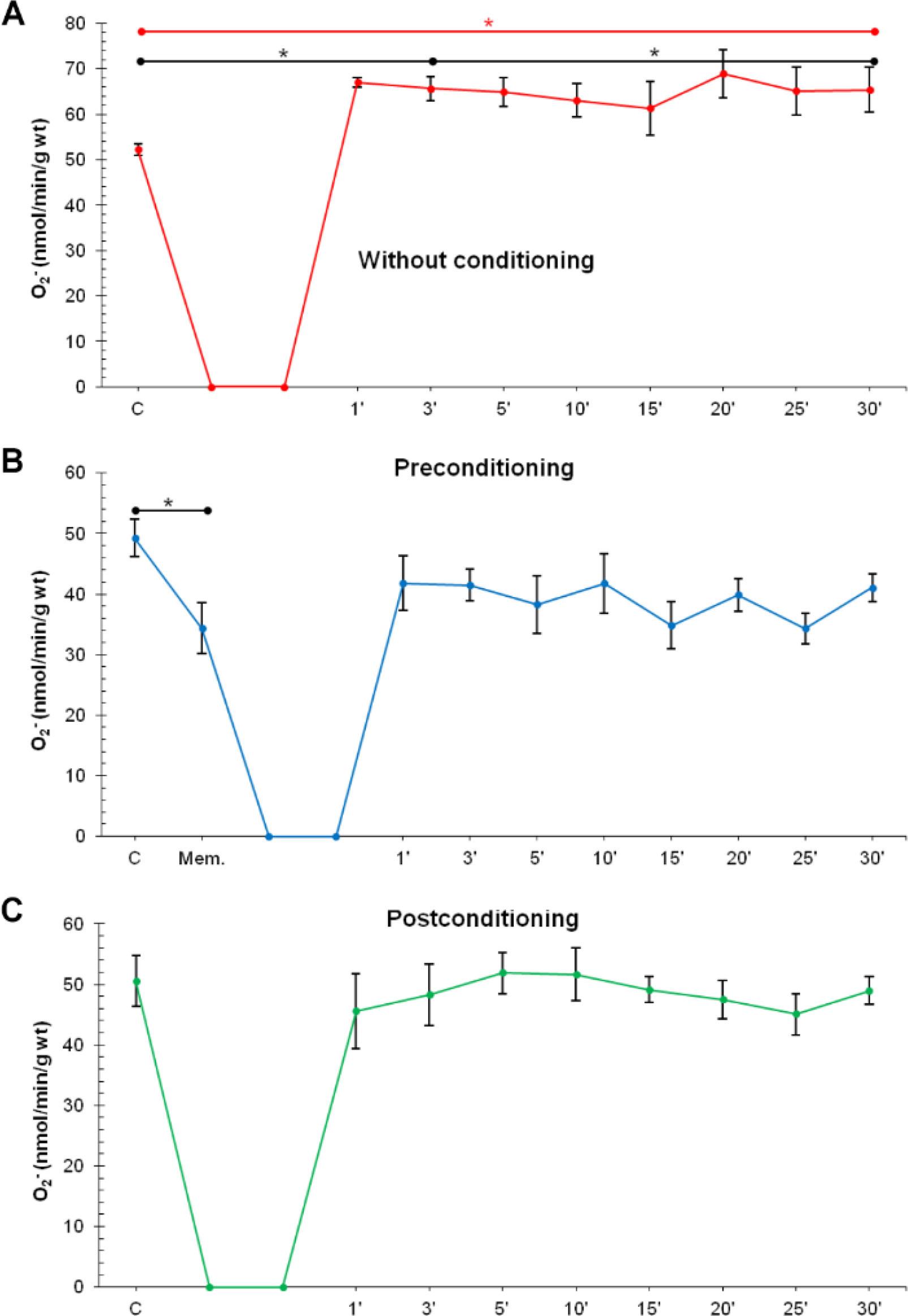 The values of superoxide anion radical (O2−) in the CG were significantly increased in the third and last minute of reperfusion compared to the control values, while in the PreC group MK-801 induced significant decrease of O2− levels, but in the postconditioning values were similar to the control values. In the PostC group, there were no statistically significant changes in O2− values (Figure 3A, 3B, 3C).