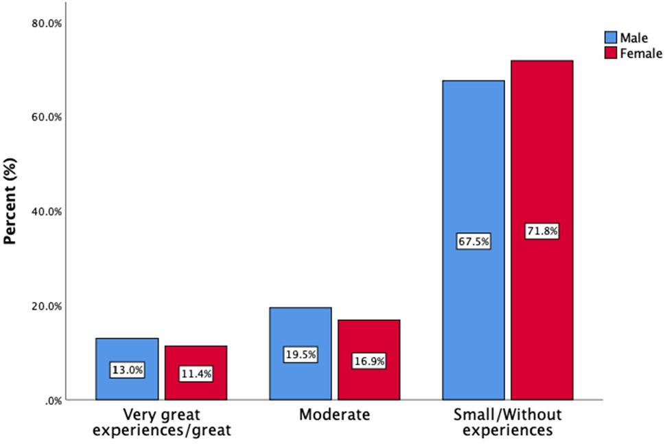 Distribution of responses on Question (Q4): Have you had previous experiences with online education? in relation to gender in study population. The answers are categorized into the following categories: Very great experiences/great, Moderate experiences and Small/without experiences. Results are presented as frequency in percent (%).