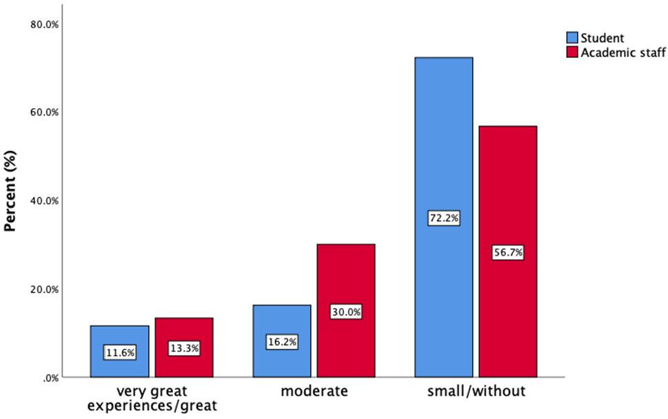 Distribution of responses on Question (Q4): Have you had previous experiences with online education? in relation academic status in study population. The answers are categorized into the following categories: Very great experiences/great, Moderate experiences and Small/without experiences. Results are presented as frequency in percent (%).