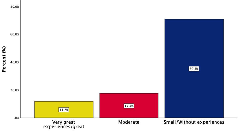 Distribution of responses on Question (Q4): Have you had previous experiences with online education? in study population in general. The answers are categorized into the following categories: Very great experiences/great, Moderate experiences and Small/without experiences. Results are presented as frequency in percent (%).