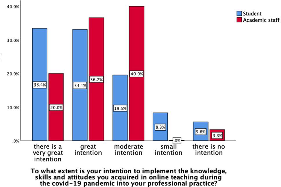 Furthermore, a large number of students and academic staff reported no or no difficulties at all in testing the knowledge during online education. Then, most of students reported that gaining professional experience during online classes was went with large difficulties but not for academic staff in the same time. Also, most of the student population reported that in assessing the quality of study during online teaching were present some difficulties.