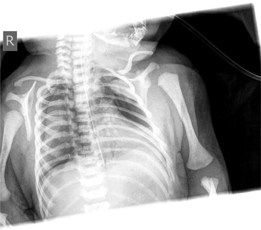 In the year 1844, Bricheteau was the first to describe pneumopericardium, an abnormal presence of air in the pericardial cavity. PPCs occurrence can be divided into spontaneous or more often associated with positive pressure ventilation. In neonates, it can also be isolated or combined with other air leak syndromes, e.x. pneumothorax, pneumomediastinum, pulmonary interstitial emphysema. (3) Clinically, PPC can either be presented as non-tension or tension pneumopericardium, which is far more dangerous because it possibly leads to cardiac tamponade and deadly circulatory failure. (1) Spontaneous pneumothorax and PPC are rarely presented together in a term infant without mechanical ventilation, as in our case. (3) The exact pathophysiology of neonatal pneumopericardium is still unclear, however one of the possible mechanism thought to be responsible for pneumopericardium is the ‘’Macklin effect’’. Alveolar rupture is the result of increased pressure gradient between the intraalveolar and the interstitial space. It is followed by air leakage into the pulmonary interstitium. Due to its connection with the peribronchial and pulmonary perivascular sheaths, air flows to the hilum of the lung and then to the mediastinum. From there on, air tracks near the area of pulmonary veins, at the place lacking collagenous tissue also described as ’’anatomical area of weakness’’. It flows into the pericardial sac resulting in pneumopericardium. (5) It is possible that if connection of pericardium is made with the bronchial tree air can also leek into its cavity. (4) The infant, in our case, cried immediately after birth and did not require any interventions. Pneumothorax that soon occurred is thought to be spontaneous, and etiology of PPC is considered multifactorial. Combined ventilation mechanism (‘’Macklin effect’’) with inadequate fixation of the chest drain that resulted in its deeper placement and possible tear of pericardium, most likely led to PPC. We believe this was the cause of PPC because after repositioning of the chest drain clinical and radiographical signs of the PPC disappeared in the following days. Clinical presentation of PPC can be asymptomatic or presented by various signs and symptoms, however none of them are specific. Patients could potentially have chest pain, dyspnea, tachypnea, palpitations, muffled heart sounds or different ECG findings. Some of them that are usually described are reduced ECG voltages, ST segment depression/elevation or T wave changes. (6) After initial clinical findings, a conformation of the diagnosis of pneumopericardium should be done using chest radiograph, which can be supported by computed tomography or echocardiography, however chest X-ray is considered a standard diagnostic method. The classical radiographical finding in PPC is a ’’Halo sign’’, recognized by air translucency outlining the heart and separating it from the lung fields by a strip of pericardium. (2,8) In our case chest radiographs showed iatrogenic PPC with spontaneous bilateral apical pneumothorax. Pneumomediastinum can be considered an important differential diagnosis. On posteroanterior chest radiograph a ’’Continuous diaphragm sign’’ can be seen in both pneumomediastinum and pneumopericardium as a translucency above the diaphragm. Although there are some radiographical similarities between there two pathologies, unlike PPC radiographic signs of pneumomediastinum show that air can stretch into the superior mediastinum, above the great vessels and around soft tissues of the neck. It also, unlike PPC, isn’t limited by the pericardial layers and gives a radiographical presence of radiotransparent retrosternal triangle. (8,9,10) Ultrasound can also be used to differentiate PPC and pneumomediastinum. The ultrasound view of subxiphoid window in pneumomediastinum is transparent with possible visualization of the heart. Ultrasonography of pneumopericardium shows presence of gas in subxiphoid window and inability to completely visualize the heart. Another sign that can be seen in PPC are diffuse A lines on various ultrasound cardiac views. If differential diagnosis is still uncertain, chest computed tomography (CT), as a gold standard, should be considered as the tool to confirm the right diagnosis. Chest CT scan of PPC usually shows parietal pericardium visible as a thin line and a heart surrounded by air-density. (11, 12) Studies show that prenatal corticosteroid application and postnatal surfactant therapy lower the risk of neonatal hyaline membrane disease and therefore air leak syndrome as well. Pneumopericardium in neonates is treated conservatively, unless a patient presents with lowering of arterial blood pressure, muffled heart sounds or rise of jugular venous pressure (Beck’s triad), which indicate life threatening cardiac tamponade. A little more than a third of simple pneumopericardium cases can progress to tension pneumopericardium, whose mortality rises up to 57%. Fortunately, the PPC in infant in our case did not progress to tension pneumopericardium. PPC therefore requires a close monitoring of oxygen saturation, heart rate, blood pressure and radiographical changes. (12,13,14) Should signs of cardiac tamponade (Beck’s triad) and cardiovascular collapse occur, patient should be immediately treated, usually by needle aspiration. Subxiphoid window is a recommended location and the procedure should be followed by antibiotics to prevent infection. Chest drain could also be used to evacuate excess air from the pericardial sac, but the most important measure to prevent PPC when applicating chest tube is careful placement and good fixation. In our case needle aspiration was not needed but since inadequate chest drain position took part in occurrence of PPC, it is very important to highlight this and for doctors to take into consideration in their future practice. (13, 15, 16) It is believed that a’’Nitrogen washout technique ’’, als