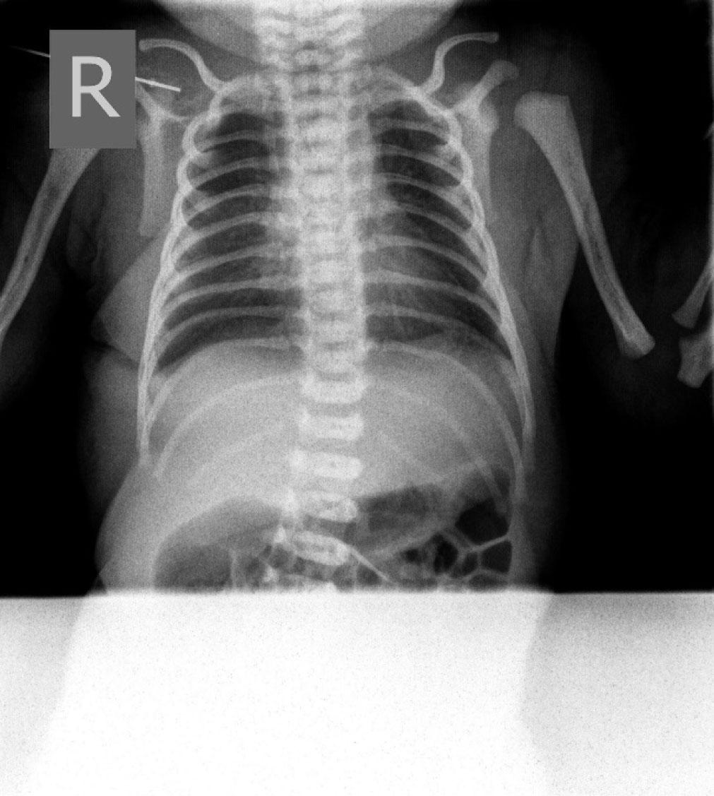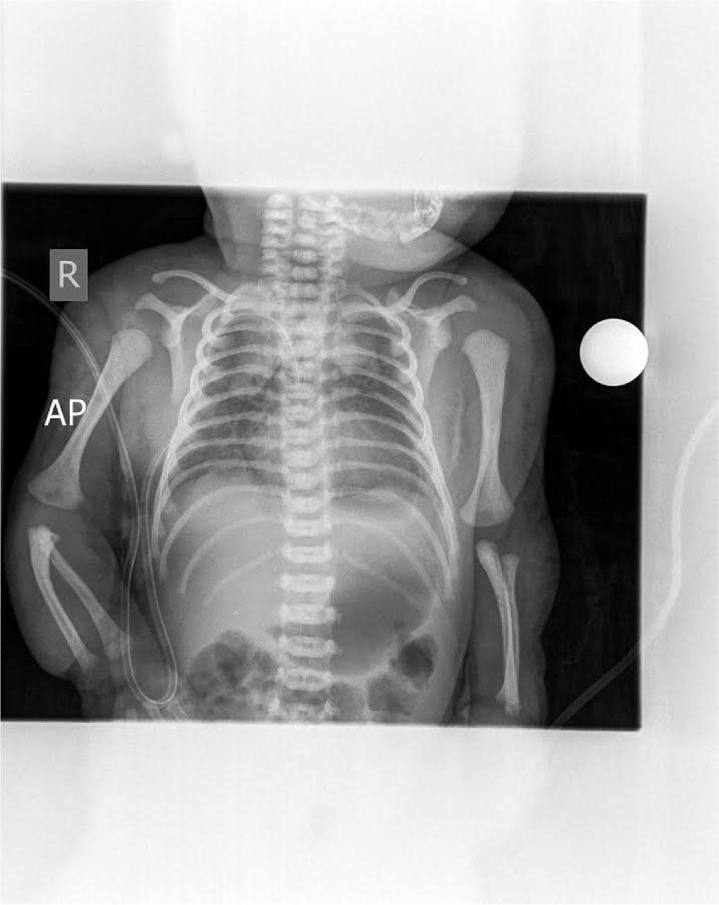 A term male infant, weighing 2700 grams at birth, was born at 39 weeks to a healthy mother (blood type O, Rh positive) delivered spontaneously by vaginal route. Pregnancy was well monitored and unremarkable. The infant cried immediately after birth and did not require any interventions. He had a birth weight of 2700 grams, a length of 52 cm and a head circumference of 34 cm. Apgar scores were 9 and 9 at 1th and 5th minutes, and infant was transferred to the postnatal unit with his mother for regular postnatal care. During the third hour of age, his skin started to become diffusely livid with evidence of respiratory distress, tachypnea (respiratory rate = 63/min) and heart rate 136/min. He was transferred to the neonatal intensive care unit (NICU) for investigation and further management. On admission, his vital signs showed a temperature of 36.6 °C, heart rate of 101 per minute and respiratory rate of 68 per minute. His blood pressure was 77/50 mmHg and his weight reduced to 2680 grams. Capillary blood gas analyzed on a Gem Premier 3000 gas analyzer showed pH 7.05; PaCO2 13.1 kPa; PaO2 2,4 kPa; bicarbonate 27.1 mmol/l; base excess of −3,4 and SaO2 84%. Nasogastric tube was placed. The chest examination showed chest retraction as compared with abdominal retraction during inhalation – 2 points; retraction of the lower intercostal muscles – 1 point; xiphoid retraction – 0 points; flaring of the nares with inhalation – 1 point; grunting on exhalation – 1 point, suggesting Silverman score = 5 points which indicates moderate respiratory distress. In view of his respiratory distress, the infant remained in the incubator and hood with 40% fraction of inspired oxygen (FiO2) was applied and 20 mg of Theophylline (Aminophylline®) given 5mg/12hours. A chest radiograph revealed bilateral apical pneumothorax in Figure 1. A chest drain was placed between anterior and midaxillary line in the 5th right intercostal space. The procedure was done in aseptic conditions after the area was cleaned with 0.015% chlorhexidine and spontaneously dried for half a minute. A dose of 0.3ml/kg of 1% lignocaine was subcutaneously applied. An incision was made using a sterile scalpel above the inferior rib. An incision place was carefully pinpointed to avoid a well-known location of important neurovascular structures right below the superior rib. The chest drain was fixated using two sterile surgical stripes. The secondary capillary blood gas analysis showed pH 7.10; PaCO2 10.4 kPa; PaO2 3,4 kPa; bicarbonate 24.2 mmol/l; base excess of −5,5 and SaO2 was 89%. The following day radiological signs of bilateral partial pneumothorax showed mild signs of resolution. Blood gas analysis on showed pH 7.35; PaCO2 5.5 kPa; PaO2 3,8 kPa; bicarbonate 22.6 mmol/l; base excess of −3 and SaO2 was 94%. The next morning the infant had tachypnea and dyspnea with SaO2 89%. Cardiovascular examination showed muffled heart sounds with no audible murmur and heart rate 123 per minute. Chest X-ray showed complete resolution of pneumothorax however classical ‘Halo’ sign appeared, (a collection of air surrounding the heart in the pericardial sac) indicating existence of pneumopericardium, which can be seen in Figure 2. The infant became acidotic and SaO2 dropped to 83%. Due to inadequate fixation of the chest drain, it spontaneously moved and may have damaged the pericardial sac. Along with the already existing pneumothorax, probably a combination of ventilation mechanism and trauma resulted in air leak into the pericardial sac. The chest drain was therefore repositioned (extracted by 3 centimeters) and due to possible progression to life threatening cardiac tamponade the infant had to be closely observed with cardiorespiratory monitoring and series of chest radiographs. Over the course of next 24 hours the clinical and radiographical signs of pneumopericardium resolved. Respiratory rate was 42 per minute and heart rate was 115 per minute. SaO2 was 96%. Thoracal drain was then removed and latter subsequent chest radiographs showed no recurrence of either pneumothorax or pneumopericardium (Figure 3). The infant remained in incubator under diffuse oxygen therapy with FiO2 40% and in the following 48 hours his oxygen requirement was weaned gradually to room air and was discontinued the next day. He was discharged on 8th day of his life. His regular follow-ups showed he was thriving well.