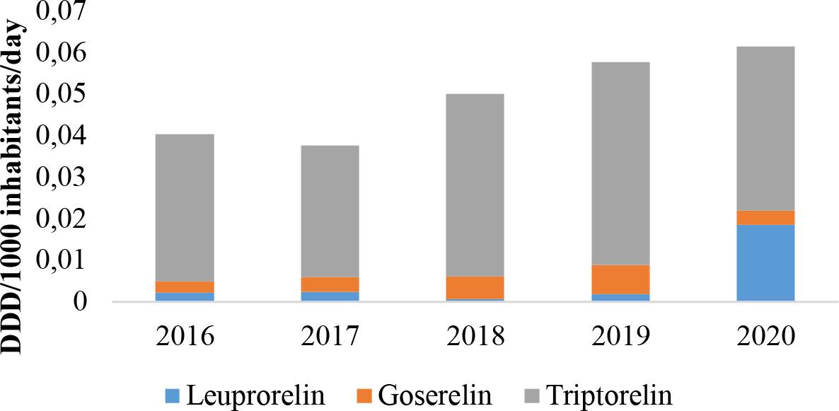 | International Nonproprietary Name/region | Consumption of LHRH agonists in DDD / 1000 / day ** per year | ||||