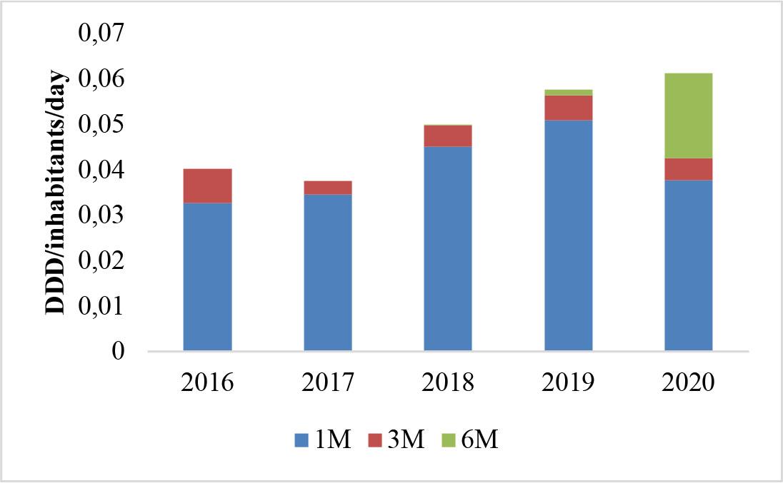 Overview of the five-year consumption of all LHRH agonists used, depending on the dose and formulation of the drug