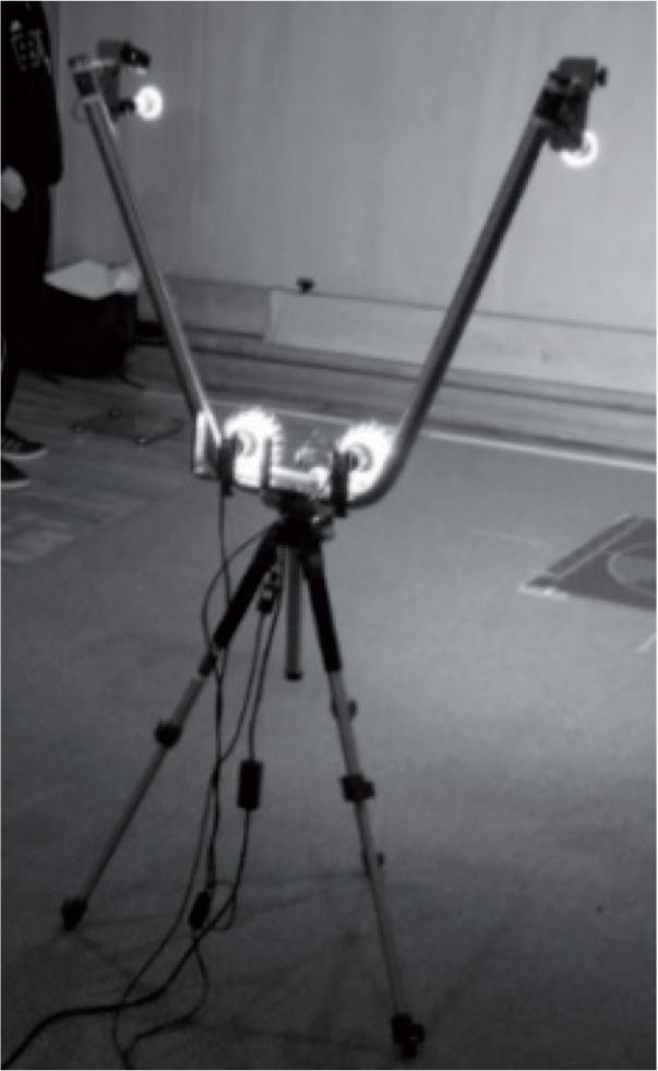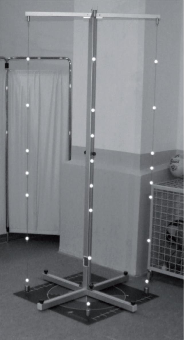 3D calibrator was placed on the surface with fluorescent markers attached to it. 3D Calibrator must be exactly placed in the centre of the measuring board (Figure 2.), and its upper and lower beams along with the vertical beam must be ideally aligned and levelled by the spirit level. The next step is to position a “V” frame supporting three cameras, enabling 3D analysis. The camera’s distance from the centre of the measuring board must be at least 2 metres and 15 centimetres (Figure 3.). The images taken by the camera need to be sharpened in the software programming, in order to start the space calibration. After the calibration has been concluded, the 3D Calibrator is packed away, and the testing can be initiated.