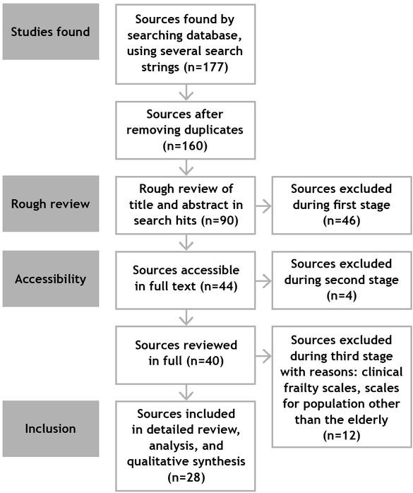 | Romero-Ortuno and Soraghan, 2014 (27) | Ireland | Quantitative design: longitudinal population- based study | 4.001 women and 3.057 men 75 or older from the Survey of Health, Aging and Retirement in Europe (SHARE) | The mortality prediction of the SHARE-FI75+ was compared with that of previous frailty scales in SHARE (SHARE-FI, 70-item index, phenotype, FRAIL). | The SHARE-FI75+ could help identify frailty in primary care. |