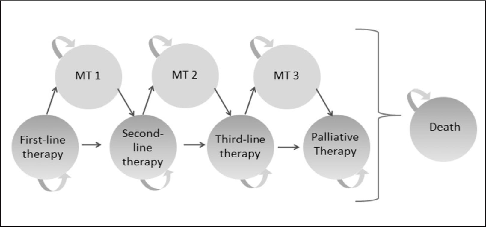Markov health states and state-to-state transitions. Legend: MT, maintenance treatment; Numbers 1, 2, and 3 indicate the treatment line.