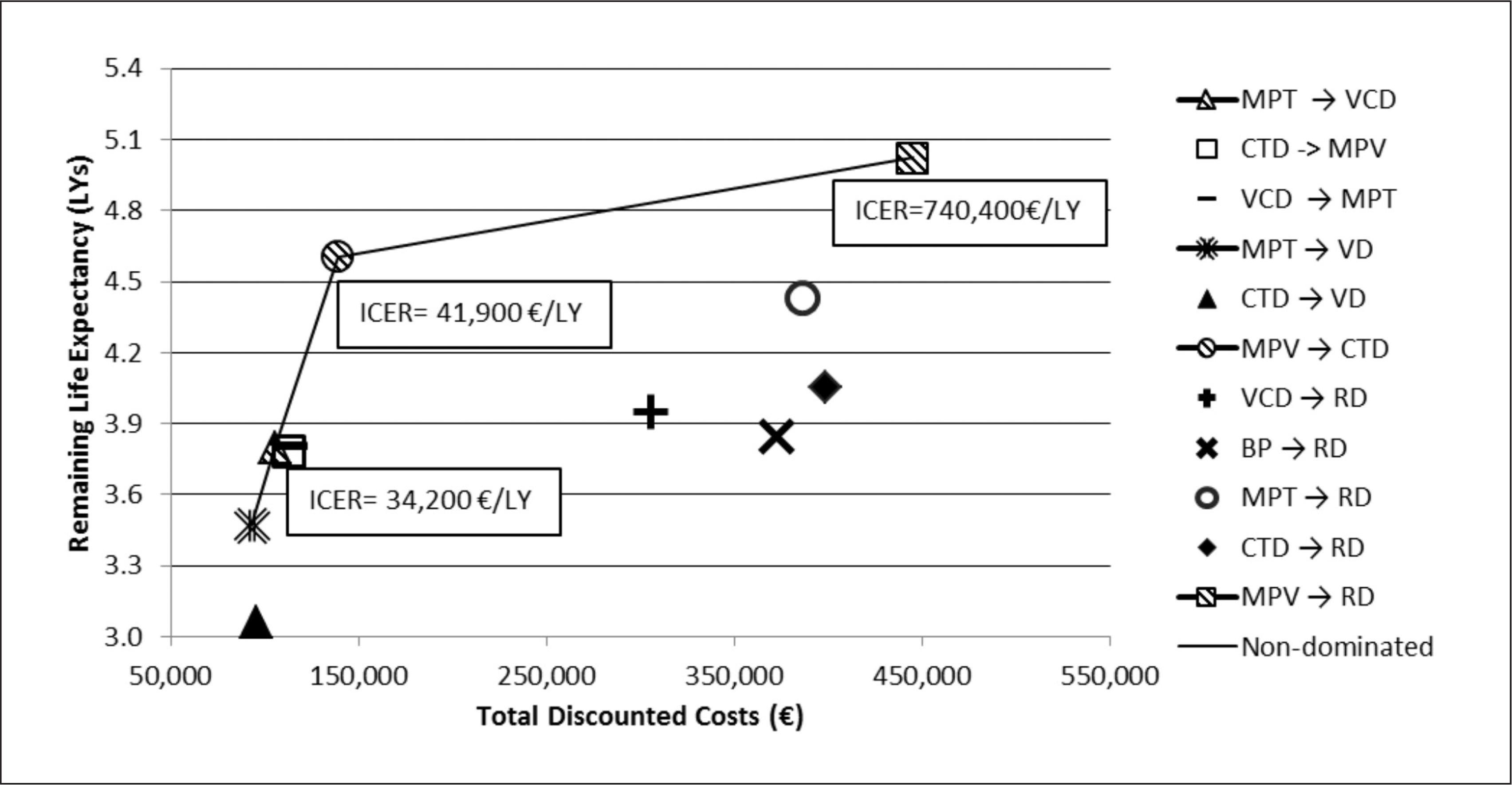 In the cost-effectiveness analysis, three strategies were identified as non-dominated: Starting with MPT, VCD, and MPV.