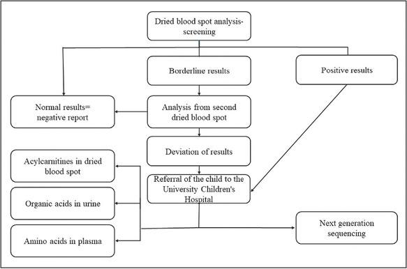 Expanded NBS is possible with tandem mass spectrometry (MS/MS), a method used for simultaneous testing of many different metabolites, including numerous acylcarnitines and amino acids on dried blood spots (DBS), which enable detection of many aminoacidopathies, organic acidurias and fatty acid oxidation disorders. Moreover, it is time-and cost-effective, with good sensitivity and specificity (5, 6, 7, 8, 9). There is also a lot of interest in implementing next-generation sequencing (NGS) into NBS programs, as it has been proven to be a valuable tool in confirming diseases, raising the possibility of family counselling, and influencing therapeutic decisions (10).