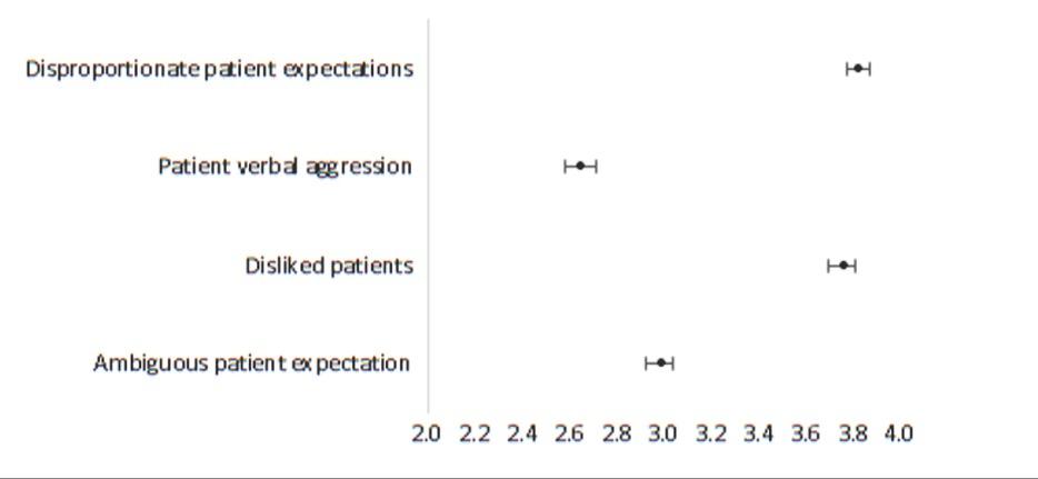 | Beta (β) | Ambiguous patient expectations | Disliked patients | Patient verbal aggression | Disproportionate patient expectations | ||||