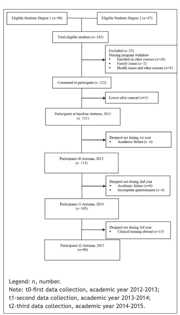 In the approached settings, all nursing students (n=140) were eligible to participate in the study. Deemed fit to participate were those who: (a) had obtained positive outcomes in the mandatory PS course offered in the first semester of the 1st academic year; (b) were admitted to clinical rotations; (c) attended the expected theoretical courses and clinical rotations in each academic year; and (d) consented to be included in the study. The cohort of students was followed-up on an annual basis up to graduation, as reported in Diagram 1.