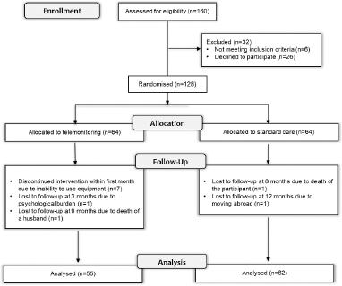 | Variable | All patients (N=117) | Telemonitoring (N=55) | Standard care (N=62) | P |