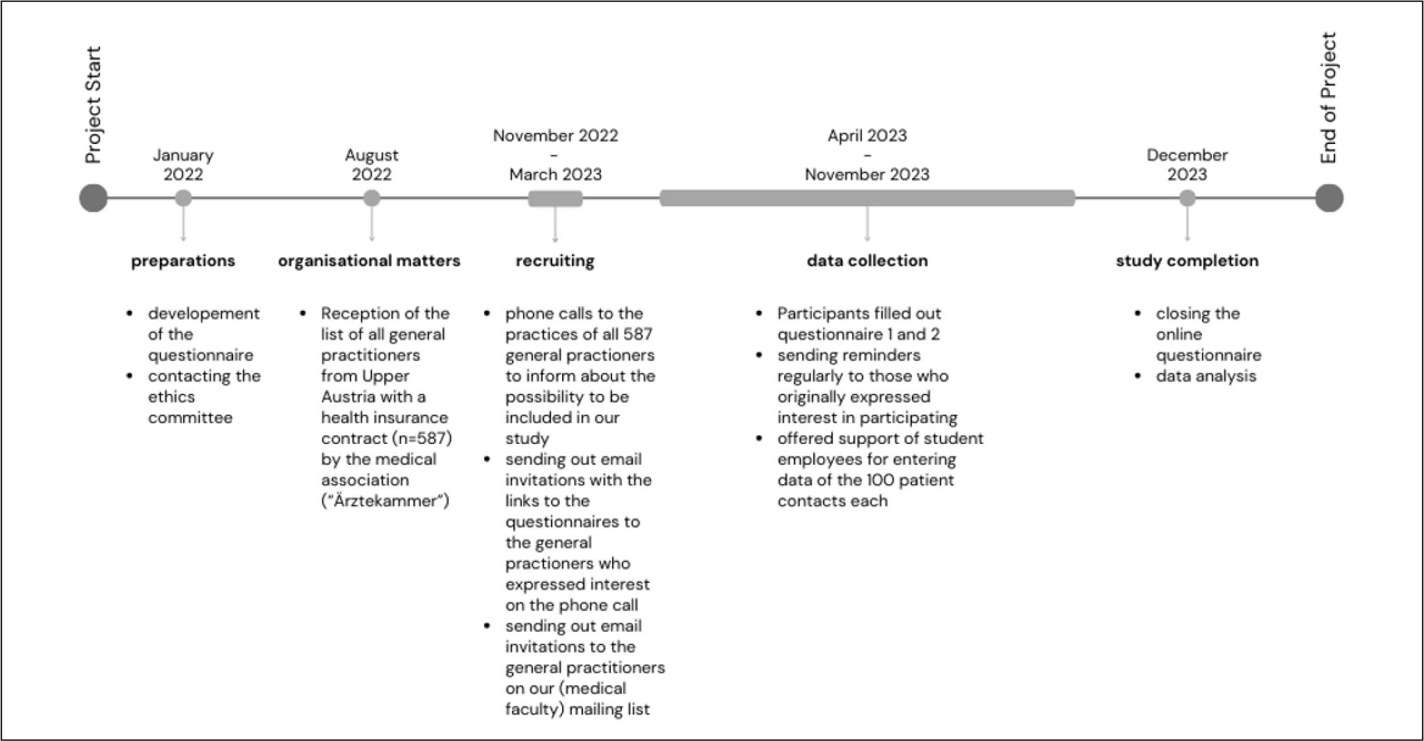 In this observational cross-sectional pilot study, we invited 587 GPs in Upper Austria to participate. Data collection occurred between April and November 2023 (Figure 1).