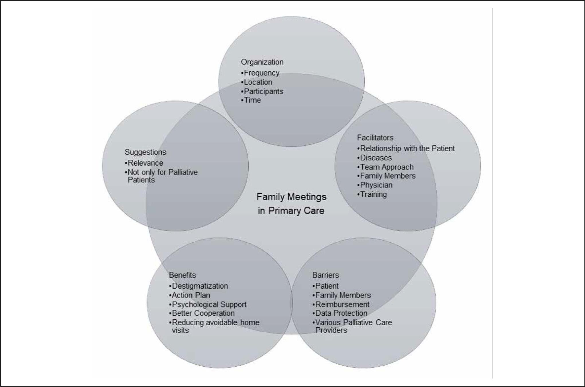 This theme included 5 categories (Patient, Family members, Reimbursement, Data Protection and Various Palliative Care Providers) and 37 codes. The most significant barrier to conducting family meetings at the primary level was a lack of time. “You really have to take at least an hour to do this. Most of them, I did them all at the patient’s home, so you must drive to them. That’s difficult during working hours… and then you go for a home visit after work.” (FP 9)