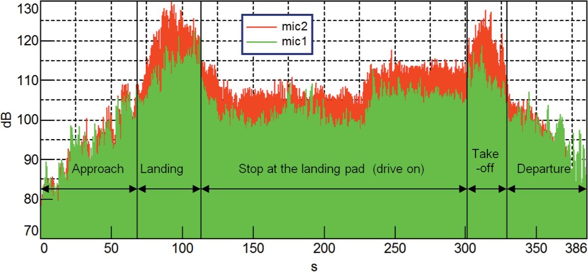 Sound pressure level recorded during helicopter manoeuvres on the landing pad.