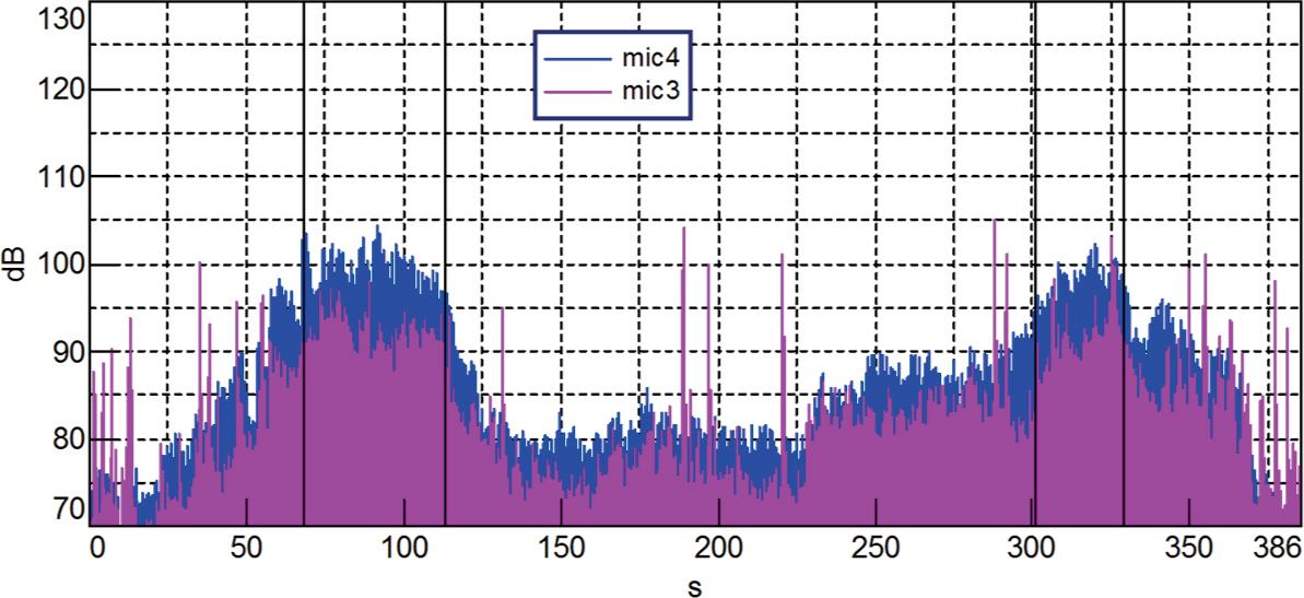 Figure 3 shows the time graphs of the acoustic pressure measured by microphones on the landing pad. The graph shows the flight phases and manoeuvres of the helicopter. Figure 4 shows the acoustic pressure measured indoors. Figure 5 shows the graphs of vibration acceleration at the same time.