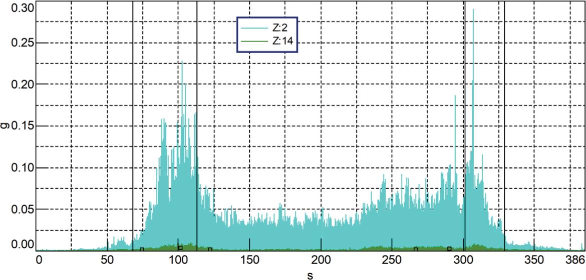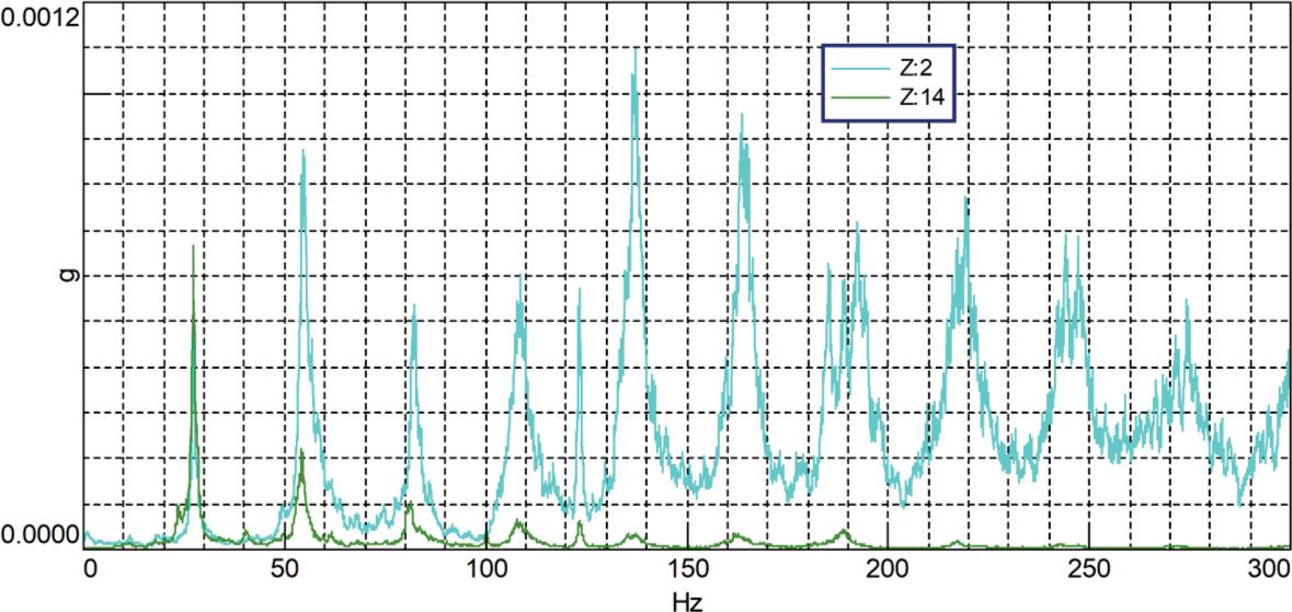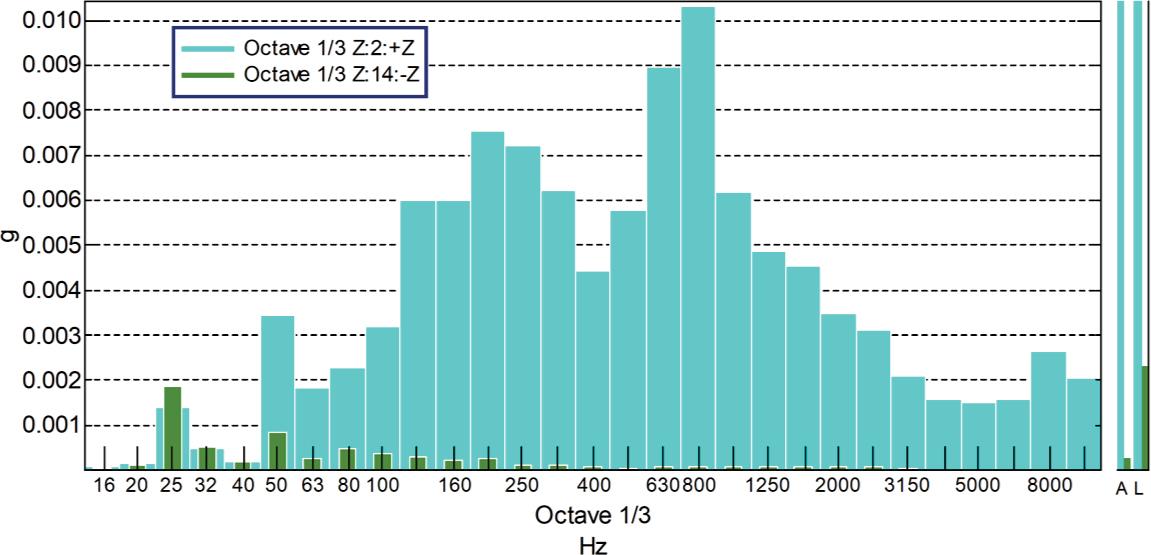 As in the case of the sound level graphs, there are increases in the vibration level for the frequencies of 25 Hz and 50 Hz. These vibrations are transmitted to the building structure and they are also visible on the indications of the accelerometer located in the patient room.