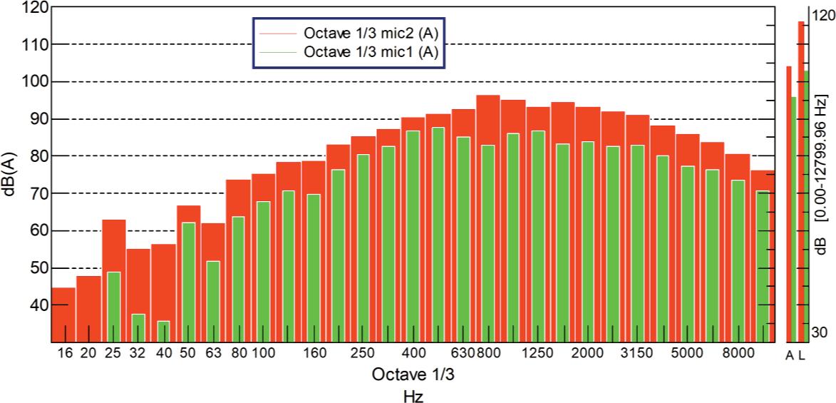 The perception of noise by the human ear depends not only on the sound pressure level but also on the sound frequency. The analysis graphs resulting in the A-curve corrected frequency domain characteristics are given in Figs 6 and 7. The graphs are presented in third octave frequency bands. For the analyses, a fragment of time signal with the highest amplitudes recorded during the helicopter landing was used.