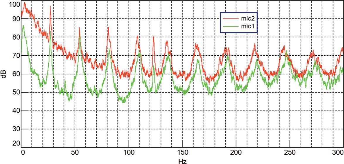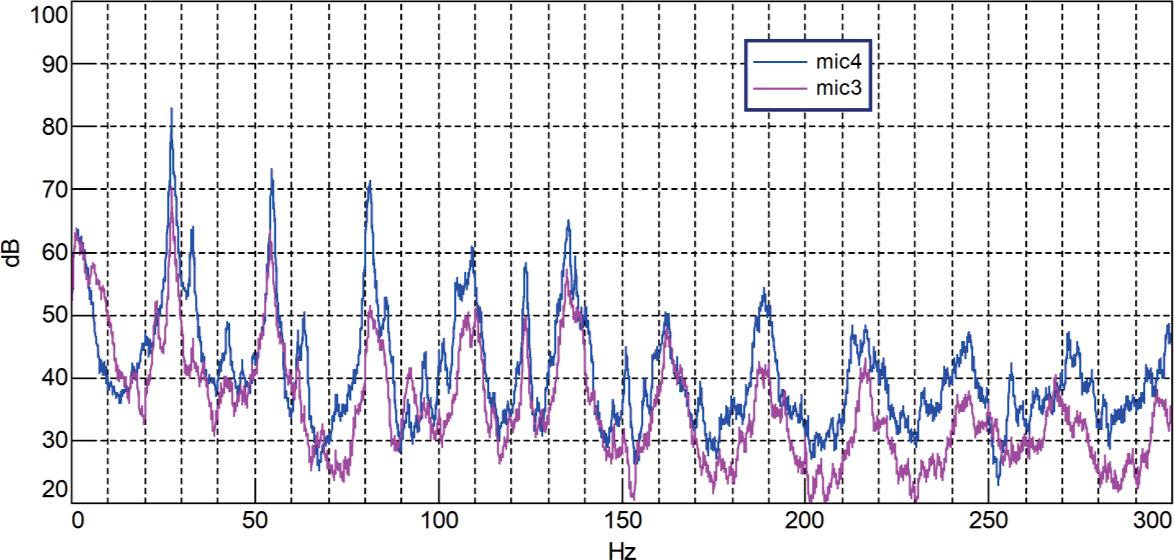 In the characteristics of the sound level (Figs 9 and 10) and the vibration amplitude (Fig. 11), the basic frequency is about 27.2 Hz (being the product of the rotational speed of the main rotor and the number of blades) and its harmonics. Thus, it can be seen that the main source of the low-frequency vibroacoustic interaction is the main rotor.