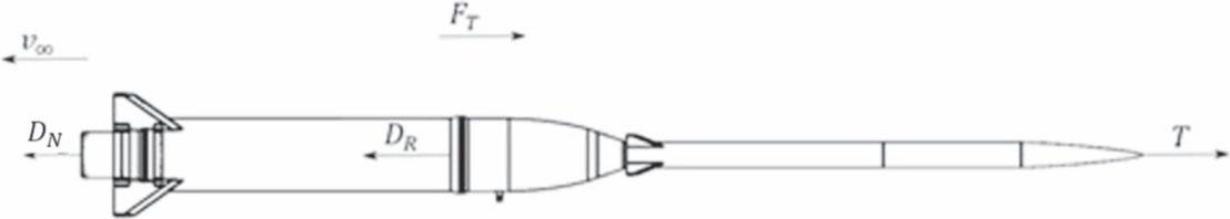 The Grot sounding rocket with the directions of the relevant axial forces is shown in Fig. 4. In the following discussions, it shall always be assumed that any component of drag is defined as positive when acting in the direction of the flow velocity
