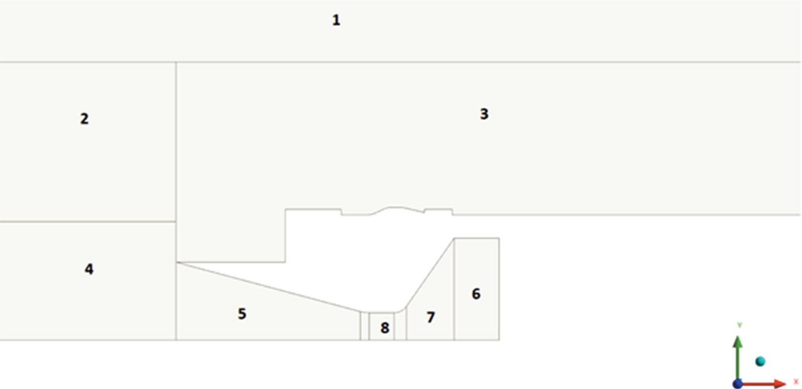The overall quality of the mesh and the solver settings determine the accuracy of the results. However, the mesh used in a study may not require a large number of elements in order to obtain a fairly accurate solution. For this reason, a mesh independency study was conducted in order to determine the appropriate mesh settings so as to have minimal effect on the accuracy of results; as a result, the final mesh contained 626,458 elements. In addition, a structured mesh is favourable for increasing the efficiency of the calculations as it requires less memory. The nozzle and the plume region experience high gradients of pressure, temperature and Mach number; therefore, it was advantageous to utilise a dense-structured mesh in these areas; for this purpose, it was necessary for the fluid domain to be split into regions (Fig. 8).